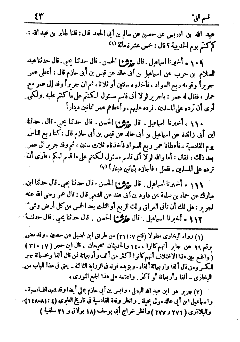 110 - حَدَّثَنَا ابْنُ أَبِي زَائِدَةَ، عَنْ إِسْمَاعِيلَ بْنِ أَبِي خَالِدٍ، عَنْ قَيْسِ بْنِ أَبِي حَازِمٍ، قَالَ: كُنَّا رُبُعَ النَّاسِ يَوْمَ الْقَادِسِيَّةِ، فَأَعْطَانَا عُمَرُ رُبُعَ السَّوَادِ، فَأَخَذْنَاهُ ثَلَاثَ سِنِينَ , ثُمَّ وَفَدَ جَرِيرٌ إِلَى عُمَرَ بَعْدَ ذَلِكَ، فَقَالَ: " أَمَا وَاللَّهِ §لَوْلَا أَنِّي قَاسِمٌ مَسْئُولٌ , لَكُنْتُمْ عَلَى مَا قُسِمَ لَكُمْ، فَأَرَى أَنْ تَرُدَّهُ عَلَى الْمُسْلِمِينَ "، فَفَعَلَ فَأَجَازَهُ بِثَمَانِينَ دِينَارًا
