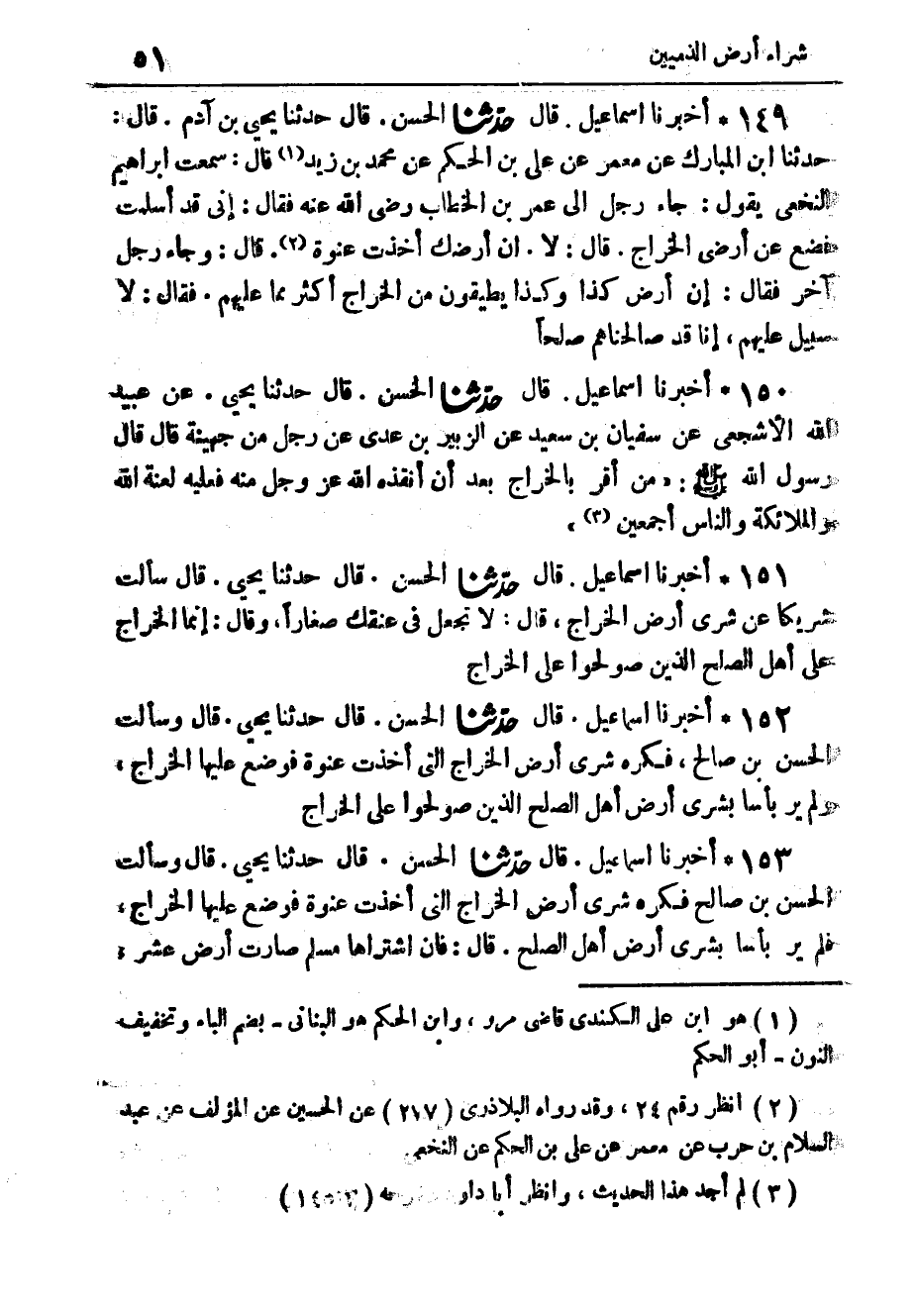 149 - أَخْبَرَنَا إِسْمَاعِيلُ، قَالَ: حَدَّثَنَا الْحَسَنُ، قَالَ: حَدَّثَنَا يَحْيَى، قَالَ: حَدَّثَنَا ابْنُ الْمُبَارَكِ، عَنْ مَعْمَرٍ، عَنْ عَلِيِّ بْنِ الْحَكَمِ، عَنْ مُحَمَّدِ بْنِ زَيْدٍ، قَالَ: سَمِعْتُ إِبْرَاهِيمَ النَّخَعِيَّ، يَقُولُ: جَاءَ رَجُلٌ إِلَى عُمَرَ بْنِ الْخَطَّابِ رَضِيَ اللَّهُ عَنْهُ، فَقَالَ: إِنِّي قَدْ أَسْلَمْتُ , فَضَعْ عَنْ أَرْضِي الْخَرَاجَ، قَالَ: " لَا، إِنَّ §أَرْضَكَ أُخِذَتْ عَنْوَةً " قَالَ: وَجَاءَ رَجُلٌ آخَرُ , فَقَالَ: إِنَّ أَرْضَ كَذَا وَكَذَا يُطِيقُونَ مِنَ الْخَرَاجِ أَكْثَرَ مِمَّا عَلَيْهِمْ، فَقَالَ: " لَا سَبِيلَ عَلَيْهِمْ، إِنَّا قَدْ صَالَحْنَاهُمْ صُلْحًا "