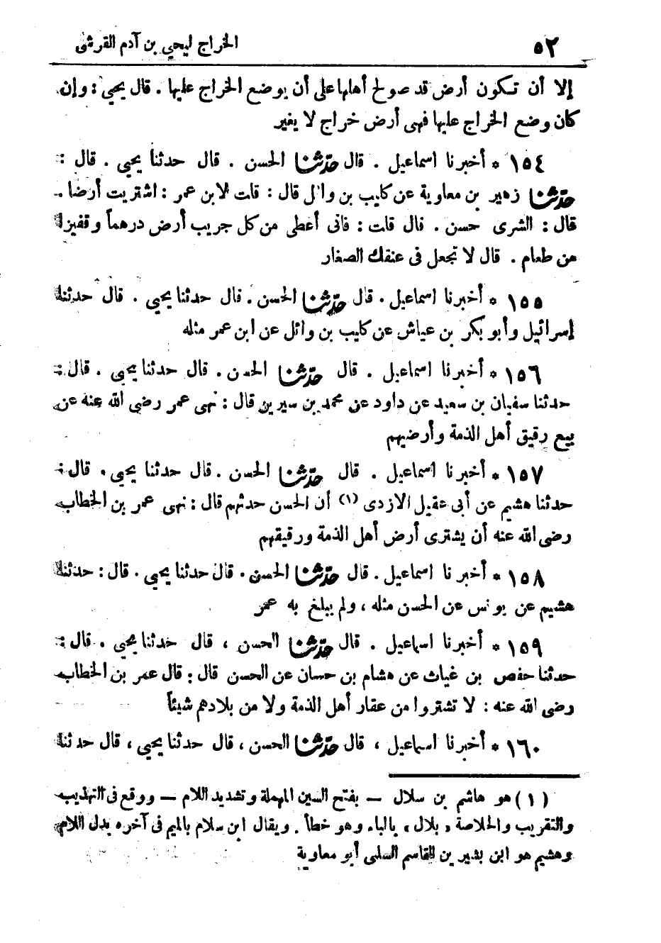157 - أَخْبَرَنَا إِسْمَاعِيلُ، قَالَ: حَدَّثَنَا الْحَسَنُ، قَالَ: حَدَّثَنَا يَحْيَى، قَالَ: حَدَّثَنَا هُشَيْمٌ، عَنْ أَبِي عَقِيلٍ الْأَزْدِيِّ، أَنَّ الْحَسَنَ، حَدَّثَهُمْ، قَالَ: " §نَهَى عُمَرُ بْنُ الْخَطَّابِ رَضِيَ اللَّهُ عَنْهُ أَنْ يُشْتَرَى أَرْضُ أَهْلِ الذِّمَّةِ وَرَقِيقُهُمْ".
