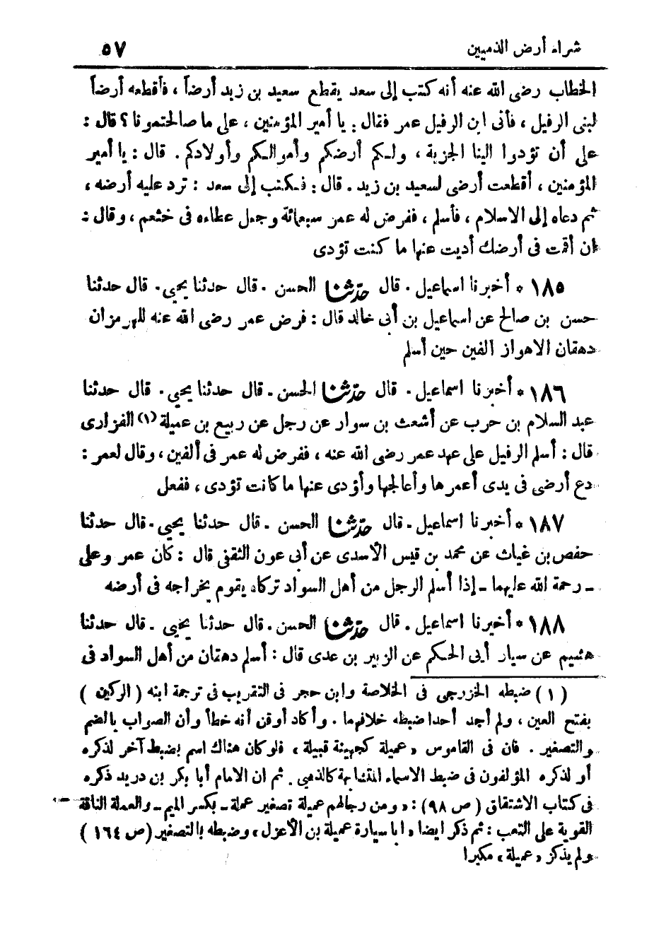 187 - أَخْبَرَنَا إِسْمَاعِيلُ، قَالَ: حَدَّثَنَا الْحَسَنُ، قَالَ: حَدَّثَنَا يَحْيَى، قَالَ: حَدَّثَنَا حَفْصُ بْنُ غِيَاثٍ، عَنْ مُحَمَّدِ بْنِ قَيْسٍ الْأَسَدِيِّ، عَنْ أَبِي عَوْنٍ الثَّقَفِيِّ، قَالَ: كَانَ عُمَرُ وَعَلِيٌّ رَحْمَةُ اللَّهِ عَلَيْهِمَا، " §إِذَا أَسْلَمَ الرَّجُلُ مِنْ أَهْلِ السَّوَادِ تَرَكَاهُ يَقُومُ بِخَرَاجِهِ فِي أَرْضِهِ "
