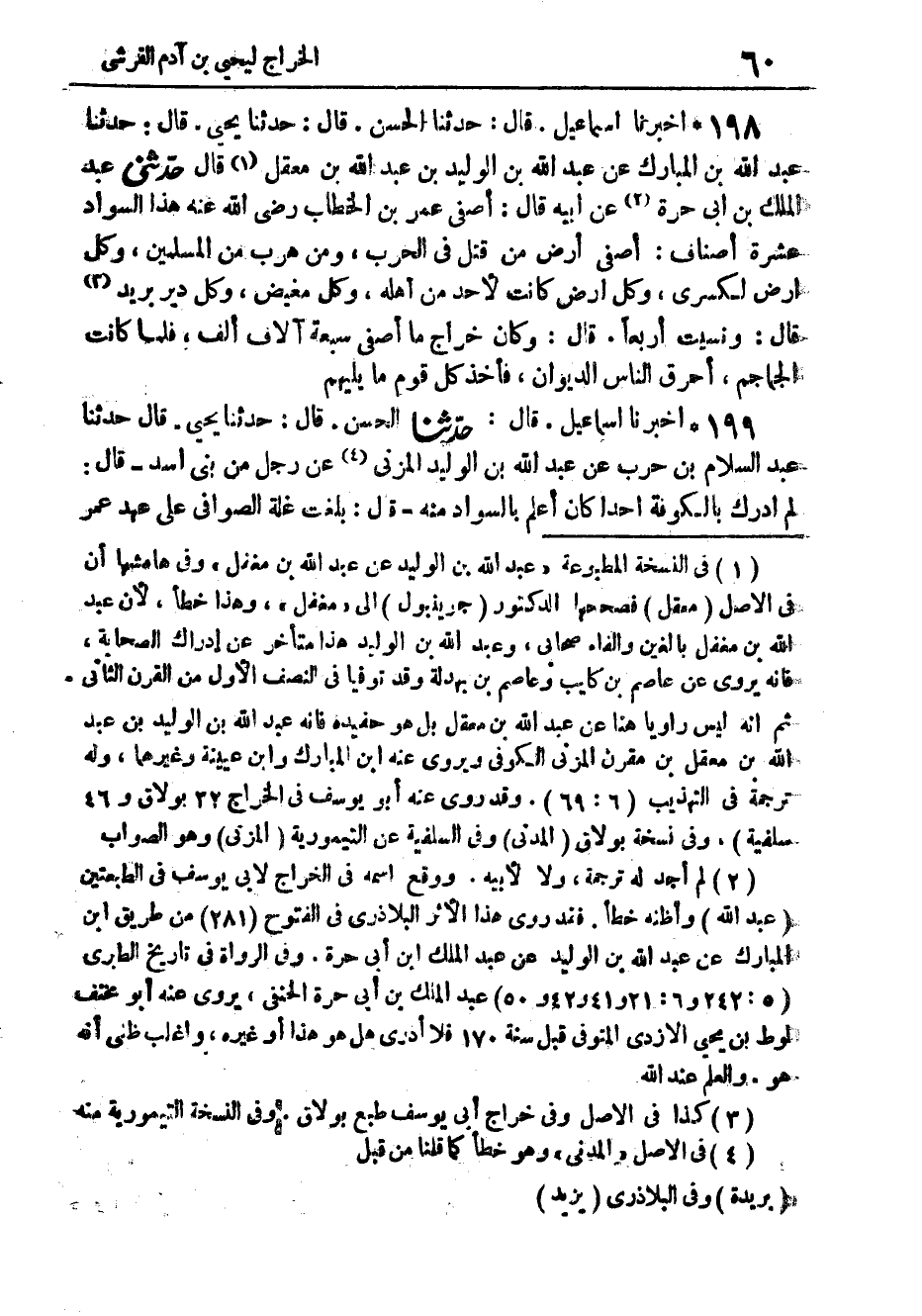198 - أَخْبَرَنَا إِسْمَاعِيلُ، قَالَ: حَدَّثَنَا الْحَسَنُ، قَالَ: حَدَّثَنَا يَحْيَى، قَالَ: حَدَّثَنَا عَبْدُ اللَّهِ بْنُ الْمُبَارَكِ، عَنْ عَبْدِ اللَّهِ بْنِ الْوَلِيدِ بْنِ عَبْدِ اللَّهِ بْنِ مَعْقِلٍ، قَالَ: حَدَّثَنِي عَبْدُ الْمَلِكِ بْنُ أَبِي حُرَّةَ، عَنْ أَبِيهِ، قَالَ: " §أَصْفَى عُمَرُ بْنُ الْخَطَّابِ رَضِيَ اللَّهُ عَنْهُ، هَذَا السَّوَادَ عَشَرَةَ أَصْنَافٍ، أَصْفَى أَرْضَ مَنْ قُتِلَ فِي الْحَرْبِ، وَمَنْ هَرَبَ مِنَ الْمُسْلِمِينَ، وَكُلَّ أَرْضٍ لِكِسْرَى، وَكُلَّ أَرْضٍ كَانَتْ لِأَحَدٍ مِنْ أَهْلِهِ، وَكُلَّ مَغِيضٍ، وَكُلَّ دَيْرِ بَرِيدٍ "، قَالَ: وَنَسِيتُ أَرْبَعًا، قَالَ: " وَكَانَ خَرَاجُ مَا أَصْفَى سَبْعَةَ آلَافِ أَلْفٍ، فَلَمَّا كَانَتِ الْجَمَاجِمُ، أَحَرَقَ النَّاسُ الدِّيوَانَ، فَأَخَذَ كُلُّ قَوْمٍ مَا يَلِيهِمْ "