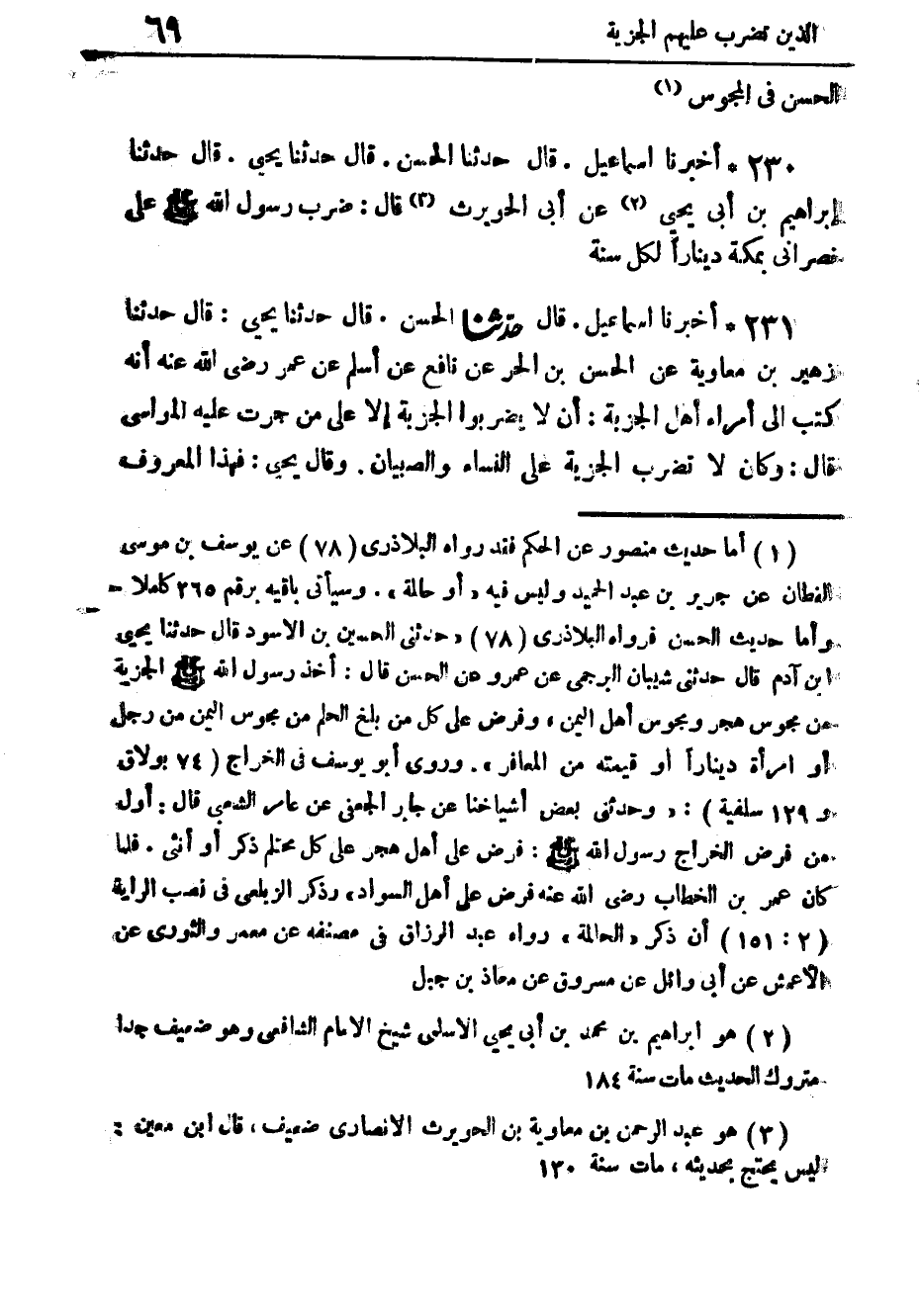 231 - أَخْبَرَنَا إِسْمَاعِيلُ، قَالَ: حَدَّثَنَا الْحَسَنُ، قَالَ: حَدَّثَنَا يَحْيَى، قَالَ: حَدَّثَنَا زُهَيْرُ بْنُ مُعَاوِيَةَ، عَنِ الْحَسَنِ بْنِ الْحُرِّ، عَنْ نَافِعٍ، عَنْ أَسْلَمَ، عَنْ عُمَرَ رَضِيَ اللَّهُ عَنْهُ، أَنَّهُ كَتَبَ إِلَى أُمَرَاءِ أَهْلِ الْجِزْيَةِ: " أَنْ §لَا يَضْرِبُوا الْجِزْيَةَ، إِلَّا عَلَى مَنْ جَرَتْ عَلَيْهِ الْمَوَاسِي "، قَالَ: " وَكَانَ لَا تُضْرَبُ الْجِزْيَةُ عَلَى النِّسَاءِ وَالصِّبْيَانِ ". وَقَالَ يَحْيَى: فَهَذَا الْمَعْرُوفُ -[70]- عِنْدَ أَصْحَابِنَا "