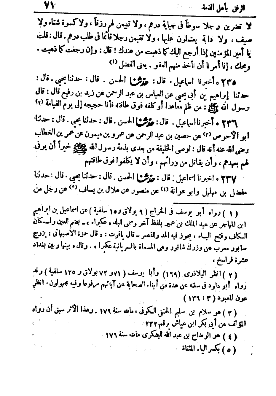 236 - أَخْبَرَنَا إِسْمَاعِيلُ، قَالَ: حَدَّثَنَا الْحَسَنُ، قَالَ: حَدَّثَنَا يَحْيَى، قَالَ: حَدَّثَنَا أَبُو الْأَحْوَصِ، عَنْ حُصَيْنِ بْنِ عَبْدِ الرَّحْمَنِ، عَنْ عَمْرِو بْنِ مَيْمُونٍ، عَنْ عُمَرَ بْنِ الْخَطَّابِ رَضِيَ اللَّهُ عَنْهُ أَنَّهُ قَالَ: " §أُوصِي الْخَلِيفَةَ مِنْ بَعْدِي بِذِمَّةِ رَسُولِ اللَّهِ صَلَّى اللهُ عَلَيْهِ وَسَلَّمَ خَيْرًا , أَنْ يُوفِيَ لَهُمْ بِعَهْدِهِمْ، وَأَنْ يُقَاتِلَ مِنْ وَرَائِهِمْ، وَأَنْ لَا يُكَلَّفُوا فَوْقَ طَاقَتِهِمْ "