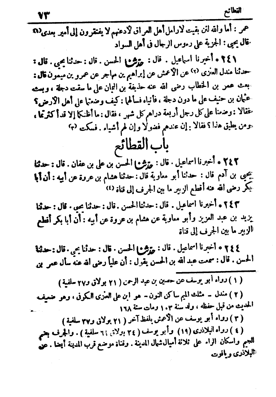 244 - أَخْبَرَنَا إِسْمَاعِيلُ، قَالَ: حَدَّثَنَا الْحَسَنُ، قَالَ: حَدَّثَنَا يَحْيَى، قَالَ: حَدَّثَنَا الْحَسَنُ، قَالَ: سَمِعْتُ عَبْدَ اللَّهِ بْنَ الْحَسَنِ يَقُولُ: إِنَّ عَلِيًّا رَضِيَ اللَّهُ عَنْهُ سَأَلَ عُمَرَ بْنَ -[74]- الْخَطَّابِ رَضِيَ اللَّهُ عَنْهُ §فَأَقْطَعَهُ يَنْبُعَ "