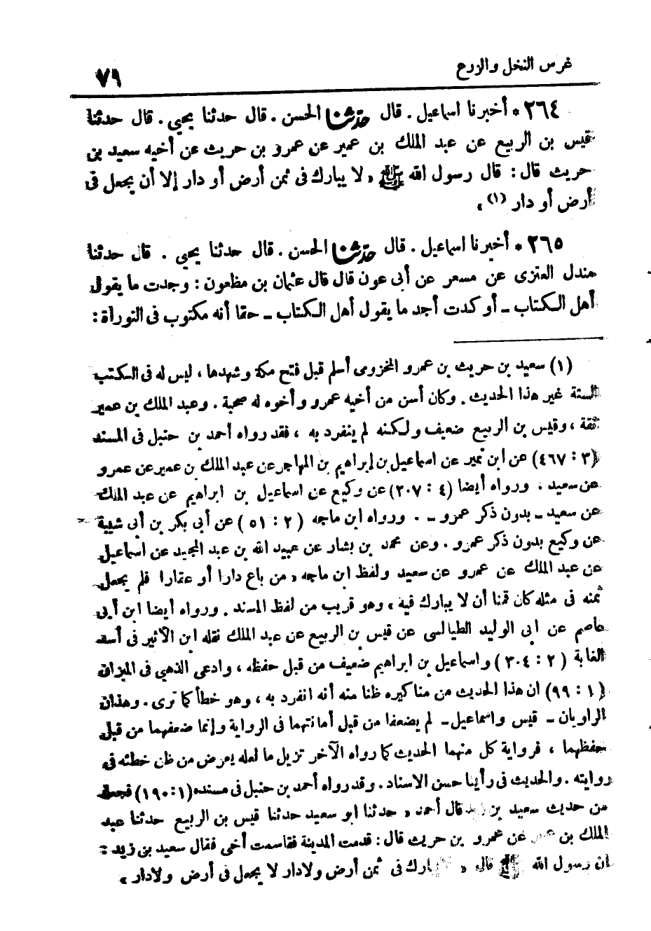 264 - أَخْبَرَنَا إِسْمَاعِيلُ، قَالَ: حَدَّثَنَا الْحَسَنُ، قَالَ: حَدَّثَنَا يَحْيَى، قَالَ: حَدَّثَنَا قَيْسُ بْنُ الرَّبِيعِ، عَنْ عَبْدِ الْمَلِكِ بْنِ عُمَيْرٍ، عَنْ عَمْرِو بْنِ حُرَيْثٍ، عَنْ أَخِيهِ سَعِيدِ بْنِ حُرَيْثٍ قَالَ: قَالَ رَسُولُ اللَّهِ صَلَّى اللهُ عَلَيْهِ وَسَلَّمَ: " §لَا يُبَارَكُ فِي ثَمَنِ أَرْضٍ أَوْ دَارٍ، إِلَّا أَنْ يُجْعَلَ فِي أَرْضٍ أَوْ دَارٍ "