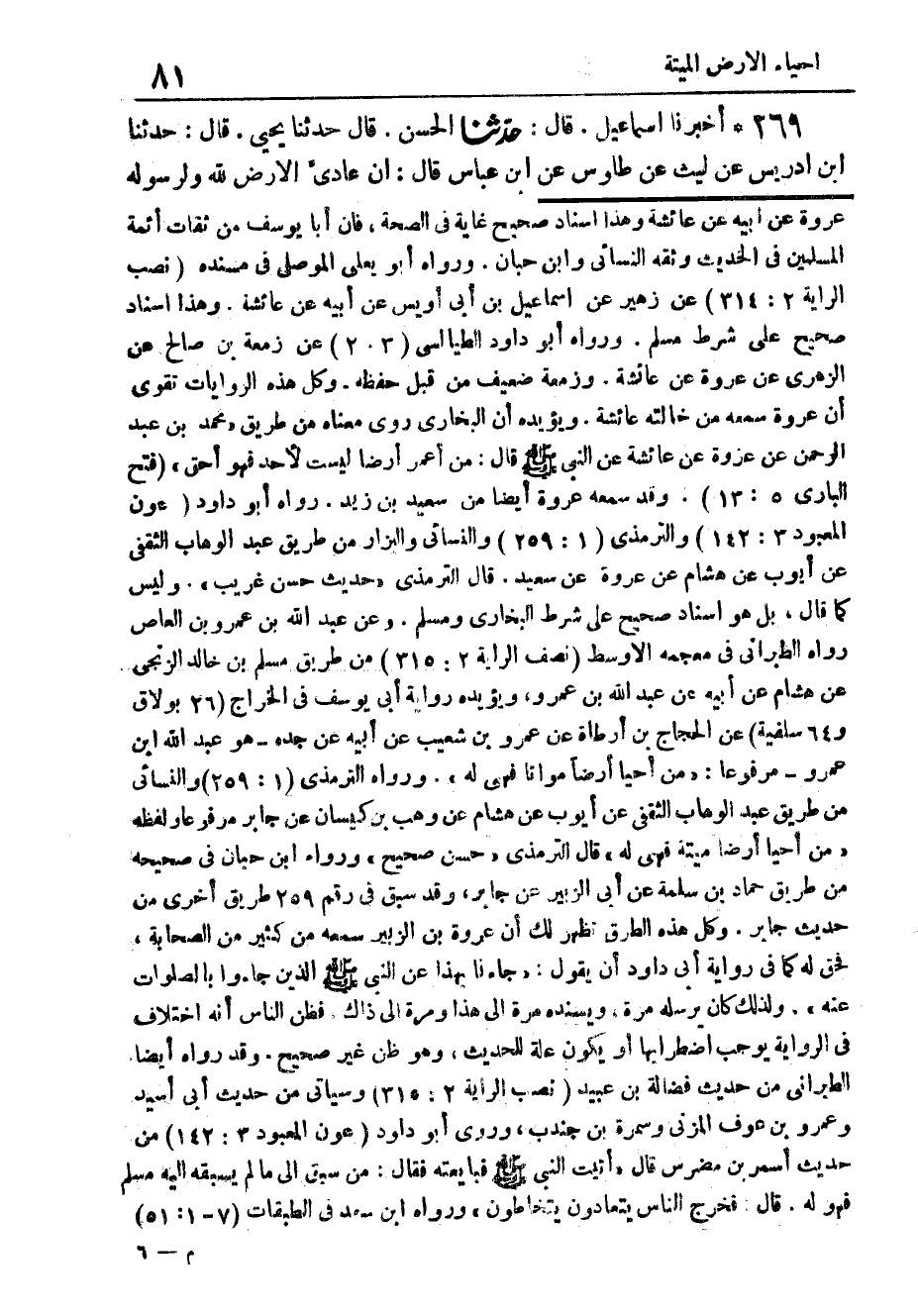 269 - أَخْبَرَنَا إِسْمَاعِيلُ، قَالَ: حَدَّثَنَا الْحَسَنُ، قَالَ: حَدَّثَنَا يَحْيَى، قَالَ: حَدَّثَنَا ابْنُ إِدْرِيسَ، عَنْ لَيْثٍ، عَنْ طَاوُسٍ، عَنِ ابْنِ عَبَّاسٍ، قَالَ " §إِنَّ عَادِيَّ الْأَرْضِ لِلَّهِ وَلِرَسُولِهِ، -[82]- وَلَكُمْ مِنْ بَعْدُ، فَمَنْ أَحْيَا شَيْئًا مِنْ مُوتَانِ الْأَرْضِ، فَهُوَ أَحَقُّ بِهِ "