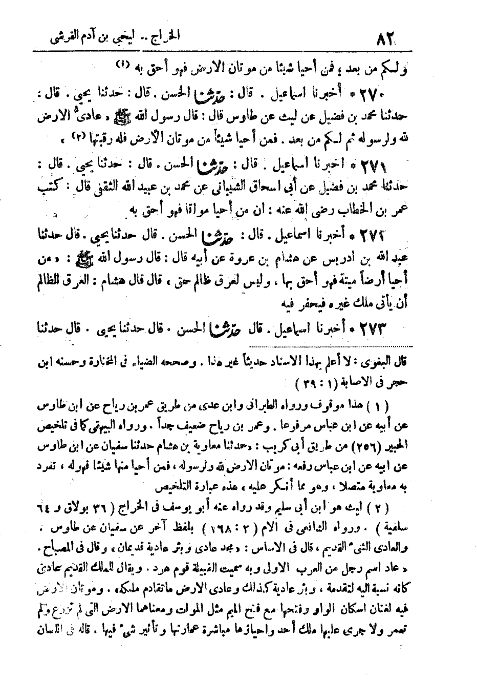 270 - أَخْبَرَنَا إِسْمَاعِيلُ، قَالَ: حَدَّثَنَا الْحَسَنُ، قَالَ: حَدَّثَنَا يَحْيَى، قَالَ: حَدَّثَنَا مُحَمَّدُ بْنُ فُضَيْلٍ، عَنْ لَيْثٍ، عَنْ طَاوُسٍ، قَالَ: قَالَ رَسُولُ اللَّهِ صَلَّى اللهُ عَلَيْهِ وَسَلَّمَ: " §عَادِيُّ الْأَرْضِ لِلَّهِ وَلِرَسُولِهِ، ثُمَّ لَكُمْ مِنْ بَعْدُ، فَمَنْ أَحْيَا شَيْئًا مِنْ مُوتَانِ الْأَرْضِ فلَهُ رَقَبَتُهَا "