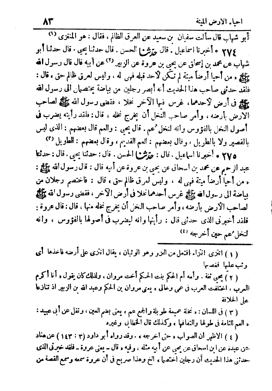 274 - أَخْبَرَنَا إِسْمَاعِيلُ، قَالَ: حَدَّثَنَا الْحَسَنُ، قَالَ: حَدَّثَنَا يَحْيَى، قَالَ: حَدَّثَنَا أَبُو شِهَابٍ، عَنْ مُحَمَّدِ بْنِ إِسْحَاقَ، عَنْ يَحْيَى بْنِ عُرْوَةَ بْنِ الزُّبَيْرِ، عَنْ أَبِيهِ، قَالَ: قَالَ رَسُولُ اللَّهِ صَلَّى اللهُ عَلَيْهِ وَسَلَّمَ: " §مَنْ أَحْيَا أَرْضًا مَيْتَةً لَمْ تَكُنْ لِأَحَدٍ قَبْلَهُ فَهِيَ لَهُ، وَلَيْسَ لِعِرْقٍ ظَالِمٍ حَقٌّ "، قَالَ: فَلَقَدْ حَدَّثَنَا صَاحِبُ هَذَا الْحَدِيثِ أَنَّهُ أَبْصَرَ رَجُلَيْنِ مِنْ بَيَاضَةَ يَخْتَصِمَانِ إِلَى رَسُولِ اللَّهِ صَلَّى اللهُ عَلَيْهِ وَسَلَّمَ فِي أَرْضٍ لِأَحَدِهِمَا، غَرَسَ فِيهَا الْآخَرُ نَخْلًا، فَقَضَى رَسُولُ اللَّهِ صَلَّى اللهُ عَلَيْهِ وَسَلَّمَ لِصَاحِبِ الْأَرْضِ بِأَرْضِهِ، وَأَمَرَ صَاحِبَ النَّخْلِ أَنْ يُخْرِجَ نَخْلَهُ، قَالَ: فَلَقَدْ رَأَيْتُهُ يُضْرَبُ فِي أُصُولِ النَّخْلِ بِالْفُؤُوسِ , وَإِنَّهُ لَنَخْلٌ عُمٌّ. قَالَ يَحْيَى: وَالْعُمُّ , قَالَ بَعْضُهُمُ: الَّذِي لَيْسَ بِالْقَصِيرِ , وَلَا بِالطَّوِيلِ، وَقَالَ بَعْضُهُمُ: الْعُمُّ: الْقَدِيمُ، وَقَالَ بَعْضُهُمُ: الطَّوِيلُ "