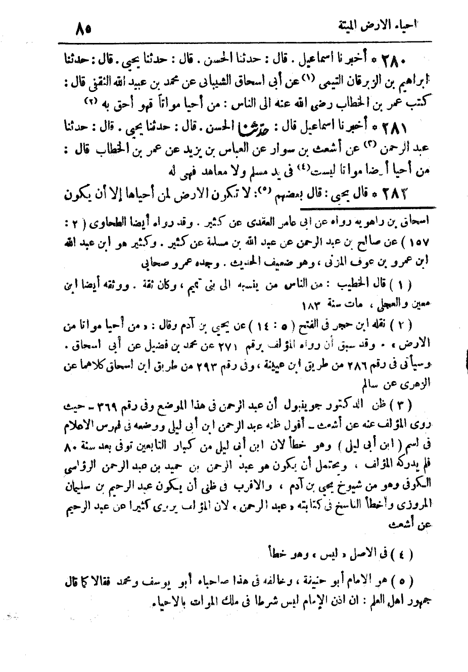 282 - " قَالَ يَحْيَى: قَالَ بَعْضُهُمْ: لَا تَكُونُ الْأَرْضُ لِمَنْ أَحْيَاهَا، إِلَّا أَنْ يَكُونَ -[86]- ذَلِكَ بِإِذْنِ الْإِمَامِ، وَقَالَ بَعْضُهُمْ: إِنْ لَمْ يَعْلَمْ بِهِ الْإِمَامُ حَتَّى يُحْيِيَهَا، فَهِيَ لَهُ. وَقَدْ جَاءَتِ الْآثَارُ: مَنْ أَحْيَا أَرْضًا مَيْتَةً فِي غَيْرِ حَقِّ مُسْلِمٍ، وَلَا مُعَاهَدٍ فَهِيَ لَهُ، وَمَنِ احْتَفَرَ بِئْرًا فَلَهُ حَرِيمُهَا أَرْبَعُونَ ذِرَاعًا " وَلَيْسَ فِي الْحَدِيثِ: " بِإِذْنِ الْإِمَامِ "