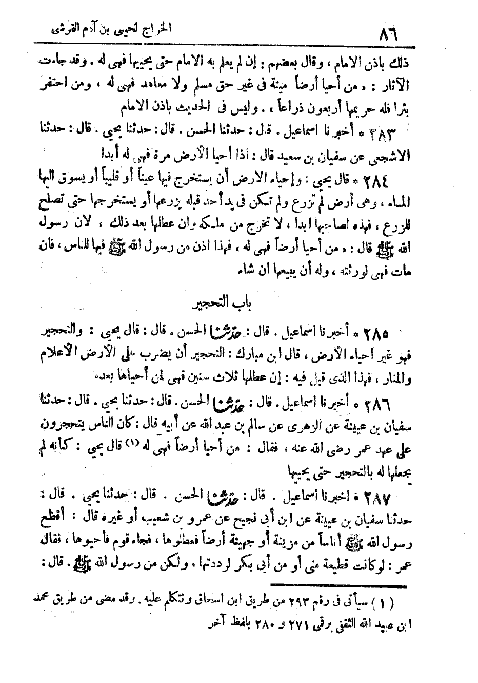 285 - أَخْبَرَنَا إِسْمَاعِيلُ، قَالَ: حَدَّثَنَا الْحَسَنُ، قَالَ: يَحْيَى، قَالَ:: " وَالتَّحْجِيرُ فَهُوَ غَيْرُ إِحْيَاءِ الْأَرْضِ ". قَالَ ابْنُ مُبَارَكٍ: " التَّحْجِيرُ أَنْ يَضْرِبَ عَلَى الْأَرْضِ الْأَعْلَامَ وَالْمَنَارَ، فَهَذَا الَّذِي قِيلَ فِيهِ: إِنْ عَطَّلَهَا ثَلَاثَ سِنِينَ، فَهِيَ لِمَنْ أَحْيَاهَا بَعْدَهُ "