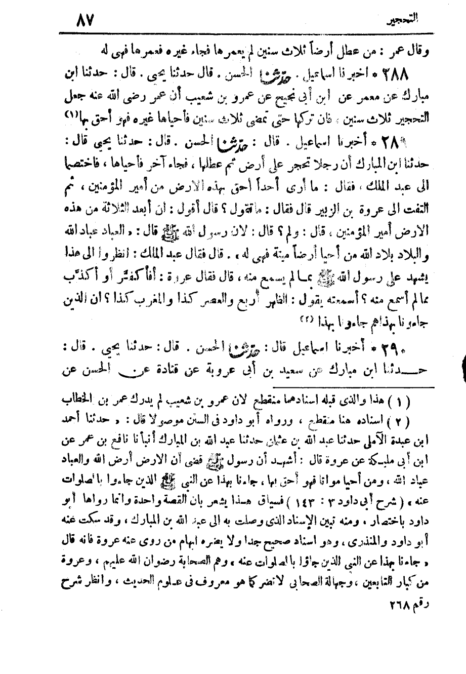 289 - أَخْبَرَنَا إِسْمَاعِيلُ، قَالَ: حَدَّثَنَا الْحَسَنُ، قَالَ: حَدَّثَنَا يَحْيَى، قَالَ: حَدَّثَنَا ابْنُ الْمُبَارَكِ، أَنَّ رَجُلًا تَحَجَّرَ عَلَى أَرْضٍ , ثُمَّ عَطَّلَهَا، فَجَاءَ آخَرُ فَأَحْيَاهَا، فَاخْتَصَمَا إِلَى عَبْدِ الْمَلِكِ، فَقَالَ: مَا أَرَى أَحَدًا أَحَقَّ بِهَذِهِ الْأَرْضِ مِنْ أَمِيرِ الْمُؤْمِنِينَ، ثُمَّ الْتَفَتَ إِلَى عُرْوَةَ بْنِ الزُّبَيْرِ قَالَ: فَقَالَ: مَا تَقُولُ؟ قَالَ: أَقُولُ: إِنَّ أَبْعَدَ الثَّلَاثَةِ مِنْ هَذِهِ الْأَرْضِ أَمِيرُ الْمُؤْمِنِينَ، قَالَ: وَلِمَ؟ قَالَ: لِأَنَّ رَسُولَ اللَّهِ صَلَّى اللهُ عَلَيْهِ وَسَلَّمَ قَالَ: " §الْعِبَادُ عِبَادُ اللَّهِ، وَالْبِلَادُ بِلَادُ اللَّهِ، وَمَنْ أَحْيَا أَرْضًا مَيْتَةً فَهِيَ لَهُ ". قَالَ: فَقَالَ عَبْدُ الْمَلِكِ: انْظُرُوا إِلَى هَذَا، يَشْهَدُ عَلَى رَسُولِ اللَّهِ صَلَّى اللهُ عَلَيْهِ وَسَلَّمَ بِمَا لَمْ يَسْمَعْ مِنْهُ، قَالَ: فَقَالَ عُرْوَةُ: أَفَأُكَفَّرُ , أَوْ أُكَذَّبُ مِمَّا لَمْ أَسْمَعْ مِنْهُ؟ أَسَمِعْتَهُ يَقُولُ: الظُّهْرُ أَرْبَعٌ، وَالْعَصْرُ كَذَا، وَالْمَغْرِبُ كَذَا؟ إِنَّ الَّذِينَ جَاءُونَا بِهَذَا , هُمْ جَاءُونَا بِهَذَا "