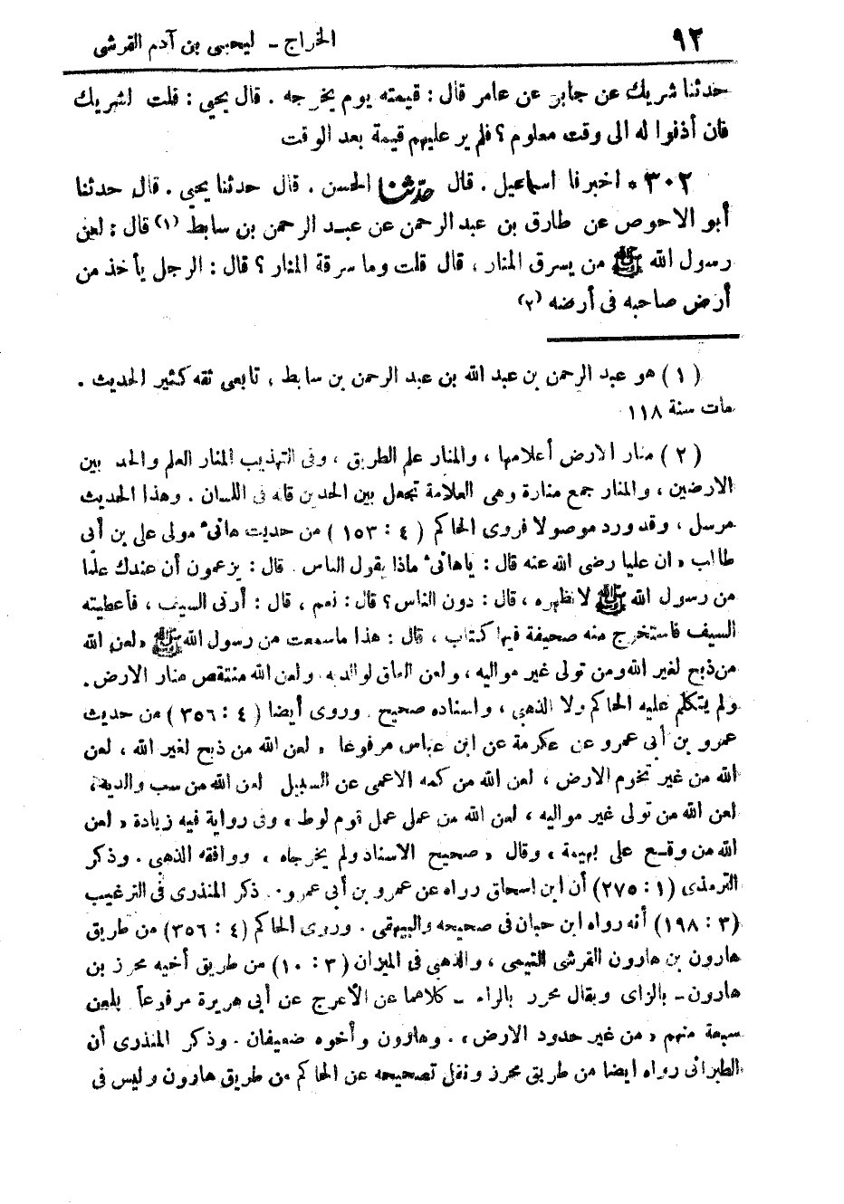 302 - أَخْبَرَنَا إِسْمَاعِيلُ، قَالَ: حَدَّثَنَا الْحَسَنُ، قَالَ: حَدَّثَنَا يَحْيَى، قَالَ: حَدَّثَنَا أَبُو الْأَحْوَصِ، عَنْ طَارِقِ بْنِ عَبْدِ الرَّحْمَنِ، عَنْ عَبْدِ الرَّحْمَنِ بْنِ سَابِطٍ، قَالَ: " §لَعَنَ رَسُولُ اللَّهِ صَلَّى اللهُ عَلَيْهِ وَسَلَّمَ مَنْ يَسْرِقُ الْمَنَارَ "، قَالَ: قُلْتُ: وَمَا سَرِقَةُ الْمَنَارِ؟ قَالَ: " الرَّجُلُ يَأْخُذُ مِنْ أَرْضِ صَاحِبِهِ فِي أَرْضِهِ "
