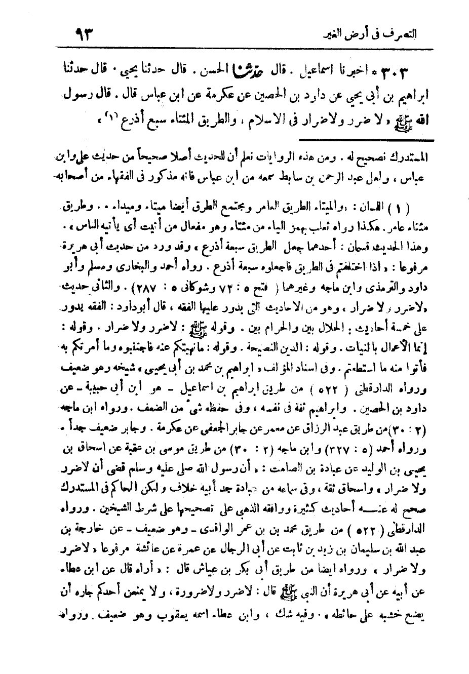 303 - أَخْبَرَنَا إِسْمَاعِيلُ، قَالَ: حَدَّثَنَا الْحَسَنُ، قَالَ: حَدَّثَنَا يَحْيَى، قَالَ: حَدَّثَنَا إِبْرَاهِيمُ بْنُ أَبِي يَحْيَى، عَنْ دَاوُدَ بْنِ الْحُصَيْنِ، عَنْ عِكْرِمَةَ، عَنِ ابْنِ عَبَّاسٍ، قَالَ: قَالَ رَسُولُ اللَّهِ صَلَّى اللهُ عَلَيْهِ وَسَلَّمَ: " §لَا ضَرَرَ، وَلَا ضِرَارَ فِي الْإِسْلَامِ، وَالطَّرِيقُ الْمِئْتَاءُ سَبْعُ أَذْرُعٍ "