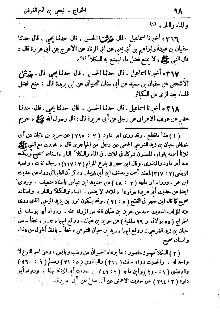 316 - أَخْبَرَنَا إِسْمَاعِيلُ، قَالَ: حَدَّثَنَا الْحَسَنُ، قَالَ: حَدَّثَنَا يَحْيَى، قَالَ: حَدَّثَنَا سُفْيَانُ بْنُ عُيَيْنَةَ، وَإِبْرَاهِيمُ بْنُ أَبِي يَحْيَى، عَنْ أَبِي الزِّنَادِ، عَنِ الْأَعْرَجِ، عَنْ أَبِي هُرَيْرَةَ، قَالَ: قَالَ النَّبِيُّ صَلَّى اللهُ عَلَيْهِ وَسَلَّمَ: " §لَا يُمْنَعُ فَضْلُ مَاءٍ لِيُمْنَعَ بِهِ الْكَلَأُ "
