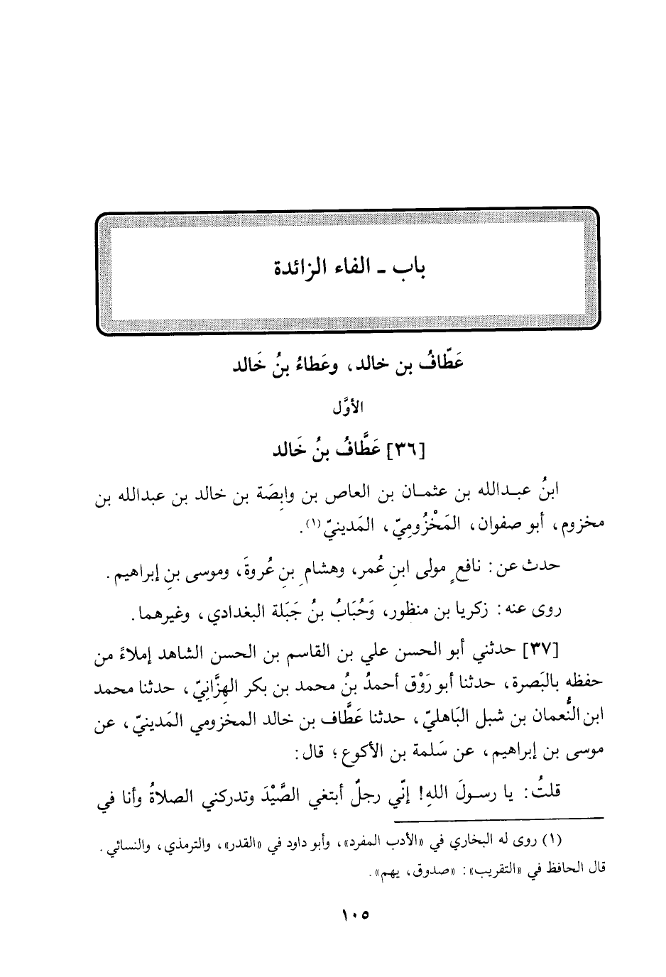 (36) عطاف بن خَالِد ابْن عبد الله بن عُثْمَان بن الْعَاصِ بن وابصة بن خَالِد بن عبد الله بن مَخْزُوم أَبُو صَفْوَان المَخْزُومِي الْمَدِينِيّ حدث عَن نَافِع مولى ابْن عمر وَهِشَام بن عُرْوَة ومُوسَى بن إِبْرَاهِيم روى عَنهُ زَكَرِيَّا بن مَنْظُور وحباب بن جبلة الْبَغْدَادِيّ وَغَيرهمَا