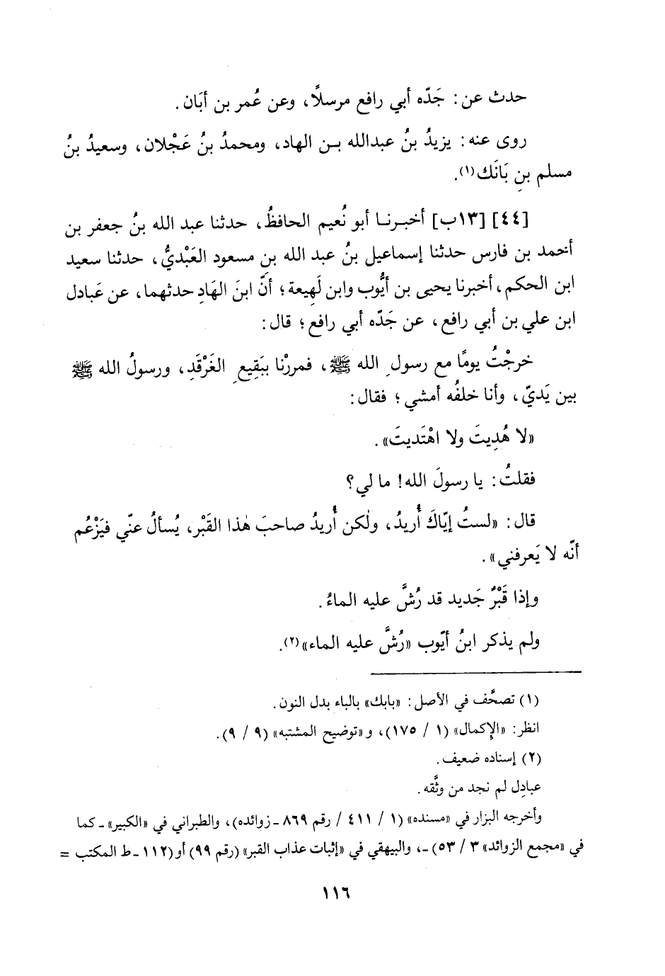 44 - (13 ب) أخبرنَا أَبُو نعيم الْحَافِظ حَدثنَا عبد الله بن جَعْفَر بن أَحْمد بن فَارس حَدثنَا إِسْمَاعِيل بن عبد الله بن مَسْعُود الْعَبْدي حَدثنَا سعيد ابْن الحكم أخبرنَا يحيى بن أَيُّوب وَابْن لَهِيعَة أَن ابْن الْهَاد حَدثهمَا عَن عبادل ابْن عَليّ بن أبي رَافع عَن جده أبي رَافع قَالَ خرجت يَوْمًا مَعَ رَسُول الله صلى الله عَلَيْهِ وَسلم فمررنا ببقيع الْغَرْقَد وَرَسُول الله صلى الله عَلَيْهِ وَسلم بَين يَدي وَأَنا خَلفه أَمْشِي فَقَالَ لَا هديت وَلَا اهتديت فَقلت يَا رَسُول الله مَا لي قَالَ لست إياك أُرِيد وَلَكِن أُرِيد صَاحب هَذَا الْقَبْر يسْأَل عني فيزعم أَنه لَا يعرفنِي وَإِذا قبر جَدِيد قد رش عَلَيْهِ المَاء وَلم يذكر ابْن أَيُّوب رش عَلَيْهِ المَاء