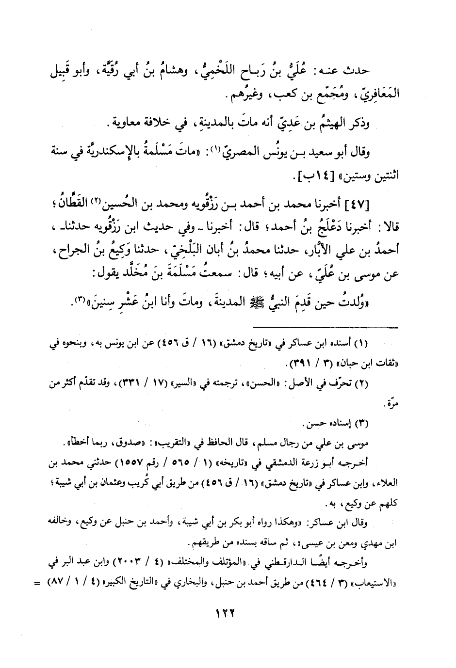 47 - أخبرنَا مُحَمَّد بن أَحْمد بن رزقويه وَمُحَمّد بن الْحُسَيْن الْقطَّان قَالَا أخبرنَا دعْلج بن أَحْمد قَالَ أخبرنَا وَفِي حَدِيث ابْن رزقويه حَدثنَا أَحْمد بن عَليّ الْأَبَّار حَدثنَا مُحَمَّد بن أبان الْبَلْخِي حَدثنَا وَكِيع بن الْجراح عَن مُوسَى بن عَليّ عَن أَبِيه قَالَ سَمِعت مسلمة بن مخلد يَقُول ولدت حِين قدم النَّبِي صلى الله عَلَيْهِ وَسلم الْمَدِينَة وَمَات وَأَنا ابْن عشر سِنِين وَالثَّانِي
