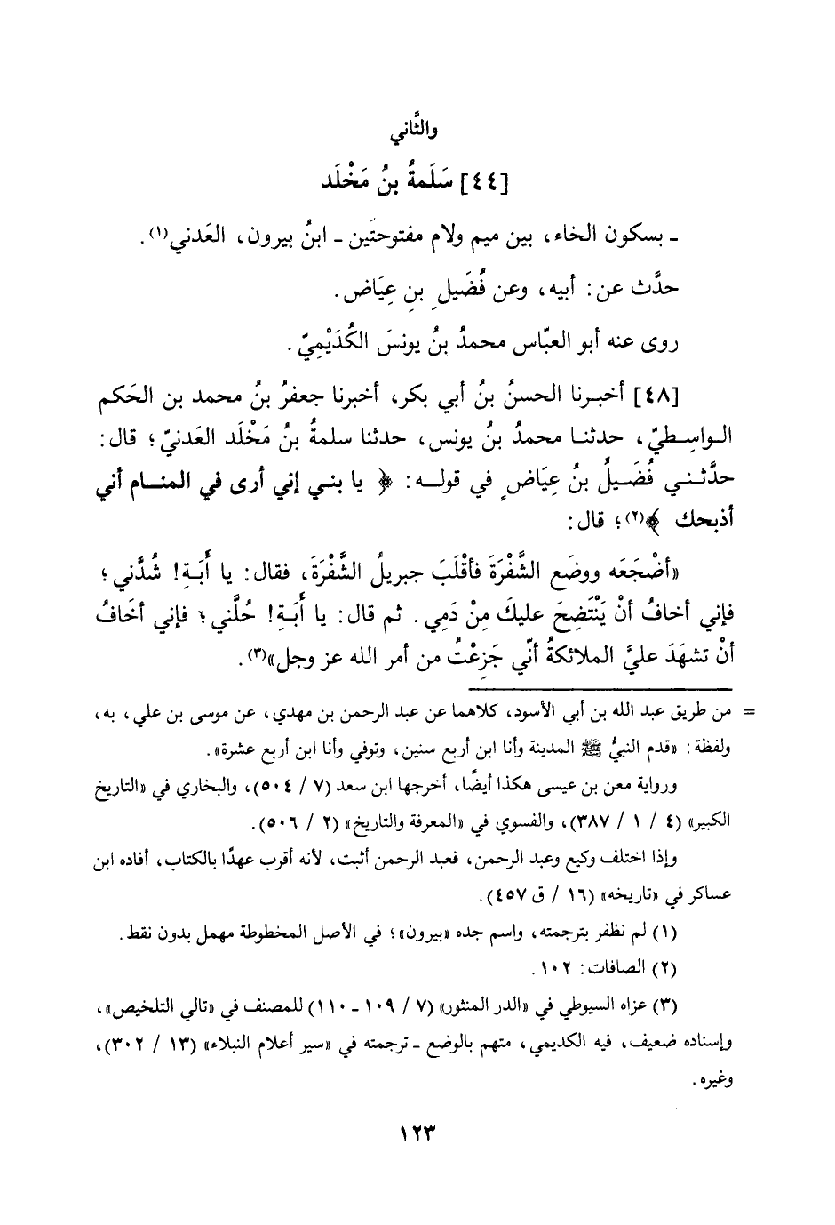 48 - أخبرنَا الْحسن بن أبي بكر أخبرنَا جَعْفَر بن مُحَمَّد بن الحكم الوَاسِطِيّ حَدثنَا مُحَمَّد بن يُونُس حَدثنَا سَلمَة بن مخلد الْعَدنِي قَالَ حَدثنِي فُضَيْل بن عِيَاض فِي قَوْله {يَا بني إِنِّي أرى فِي الْمَنَام أَنِّي أذبحك} قَالَ أضجعه وَوضع الشَّفْرَة فأقلب جِبْرِيل الشَّفْرَة فَقَالَ يَا أَبَة شدني فَإِنِّي أَخَاف أَن ينتضح عَلَيْك من دمي ثمَّ قَالَ يَا أَبَة حلني فَإِنِّي أَخَاف أَن تشهد عَليّ الْمَلَائِكَة أَنِّي جزعت من أَمر الله عز وَجل