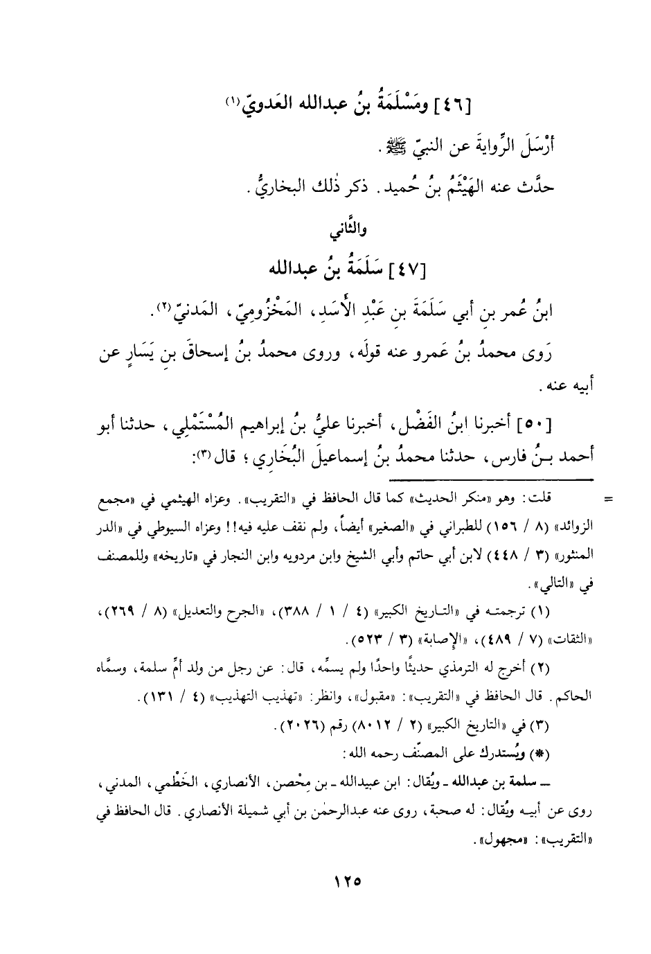 (46) ومسلمة بن عبد الله الْعَدوي أرسل الرِّوَايَة عَن النَّبِي صلى الله عَلَيْهِ وَسلم حدث عَنهُ الْهَيْثَم بن حميد ذكر ذَلِك البُخَارِيّ وَالثَّانِي