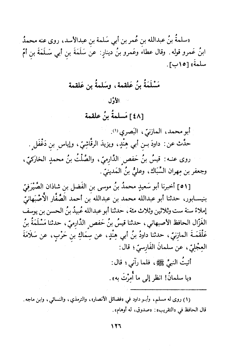 48 - مسلمة بن عَلْقَمَة أَبُو مُحَمَّد الْمَازِني الْبَصْرِيّ حدث عَن دَاوُد بن أبي هِنْد وَيزِيد الرقاشِي وَإيَاس بن دَغْفَل روى عَنهُ قيس بن حَفْص الدَّارمِيّ والصلت بن مُحَمَّد الخاركي وجعفر بن مهْرَان السباك وَعلي بن الْمَدِينِيّ