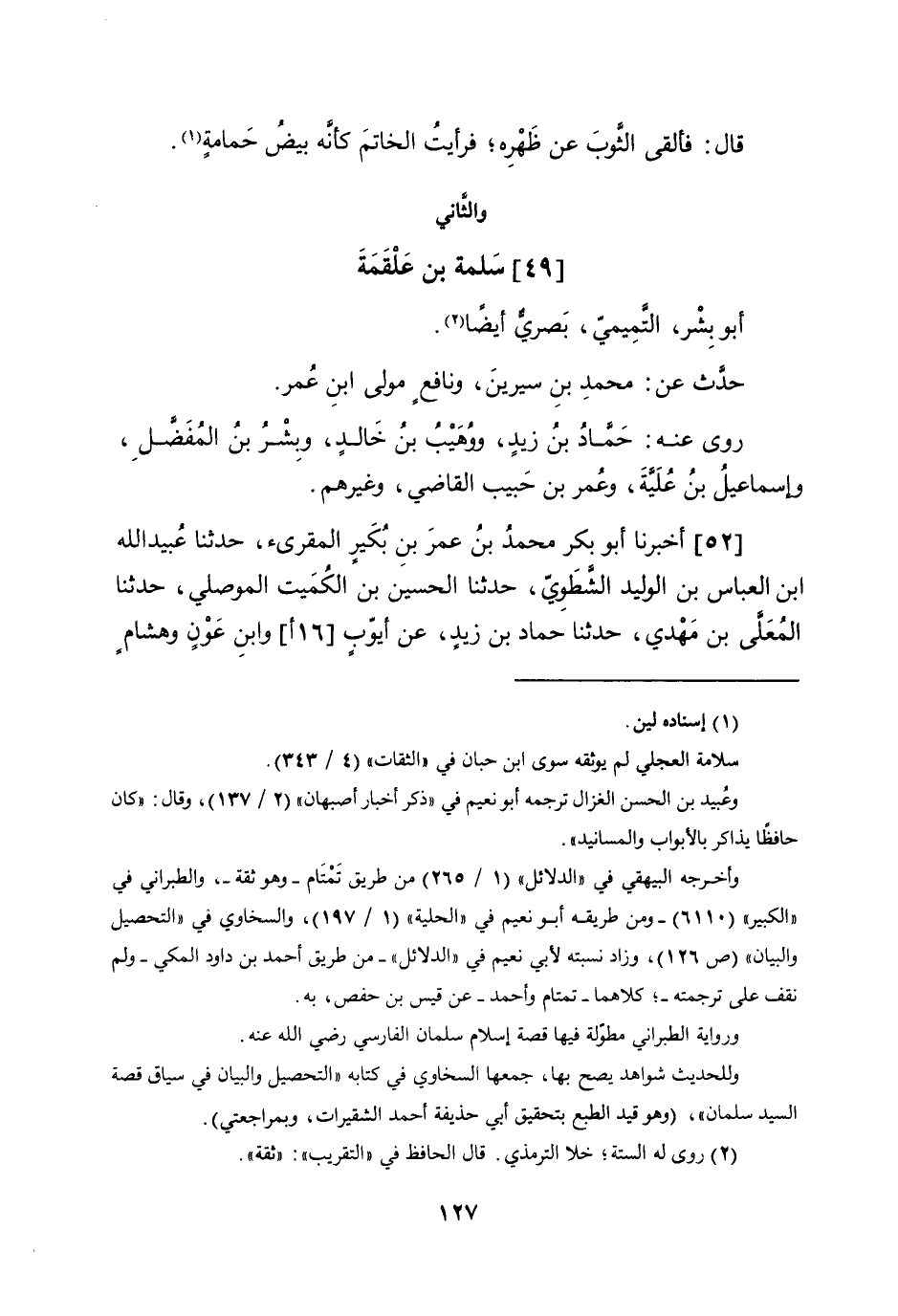 52 - أخبرنَا أَبُو بكر مُحَمَّد بن عمر بن بكير الْمُقْرِئ حَدثنَا عبيد الله ابْن الْعَبَّاس بن الْوَلِيد الشطوي حَدثنَا الْحُسَيْن بن الْكُمَيْت الْموصِلِي حَدثنَا المعلي بن مهْدي حَدثنَا حَمَّاد بن زيد عَن أَيُّوب (16 أ) وَابْن عون وَهِشَام