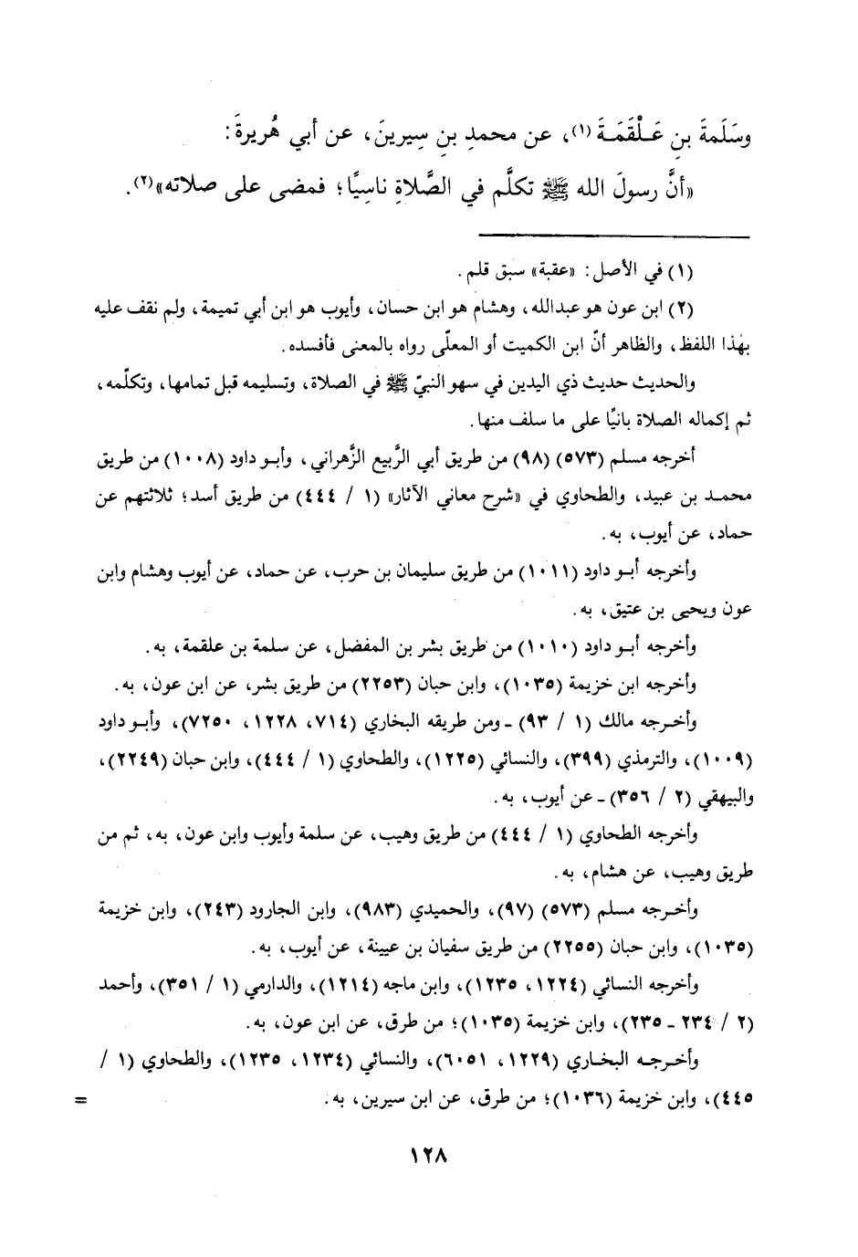 وَسَلَمَة بن عَلْقَمَة عَن مُحَمَّد بن سِيرِين عَن أبي هُرَيْرَة أَن رَسُول الله صلى الله عَلَيْهِ وَسلم تكلم فِي الصَّلَاة نَاسِيا فَمضى على صلَاته