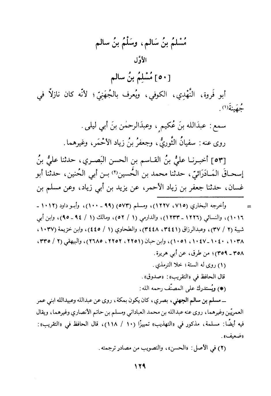 (50) مُسلم بن سَالم أَبُو فَرْوَة النَّهْدِيّ الْكُوفِي وَيعرف بالجهني لِأَنَّهُ كَانَ نازلا فِي جُهَيْنَة سمع عبد الله بن عكيم وَعبد الرَّحْمَن بن أبي ليلى روى عَنهُ سُفْيَان الثَّوْريّ وجعفر بن زِيَاد الْأَحْمَر وَغَيرهمَا