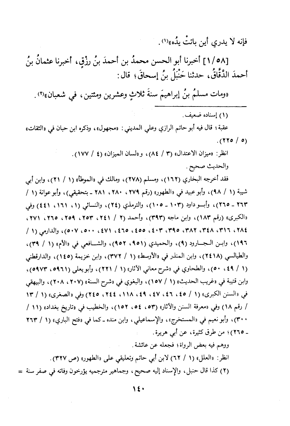 فَإِنَّهُ لَا يدْرِي أَيْن باتت يَده (581) أخبرنَا أَبُو الْحسن مُحَمَّد بن أَحْمد بن رزق أخبرنَا عُثْمَان بن أَحْمد الدقاق حَدثنَا حَنْبَل بن إِسْحَاق قَالَ وَمَات مُسلم بن إِبْرَاهِيم سنة ثَلَاث وَعشْرين ومئتين فِي شعْبَان