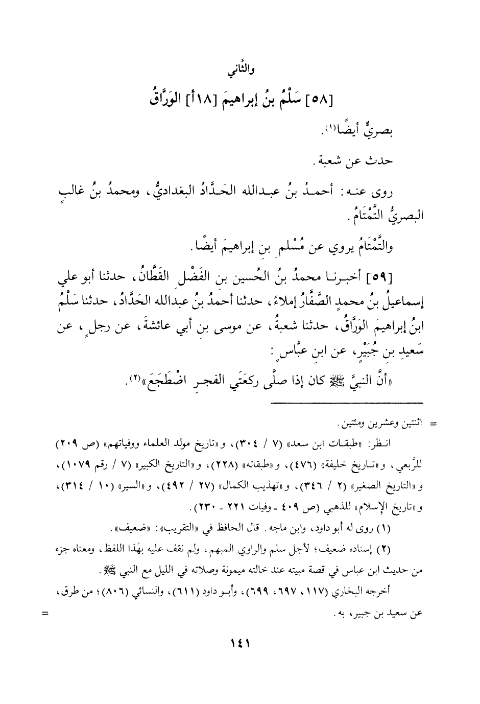 - (58) سلم بن إِبْرَاهِيم (18 أ) الْوراق بَصرِي أَيْضا حدث عَن شُعْبَة روى عَنهُ أَحْمد بن عبد