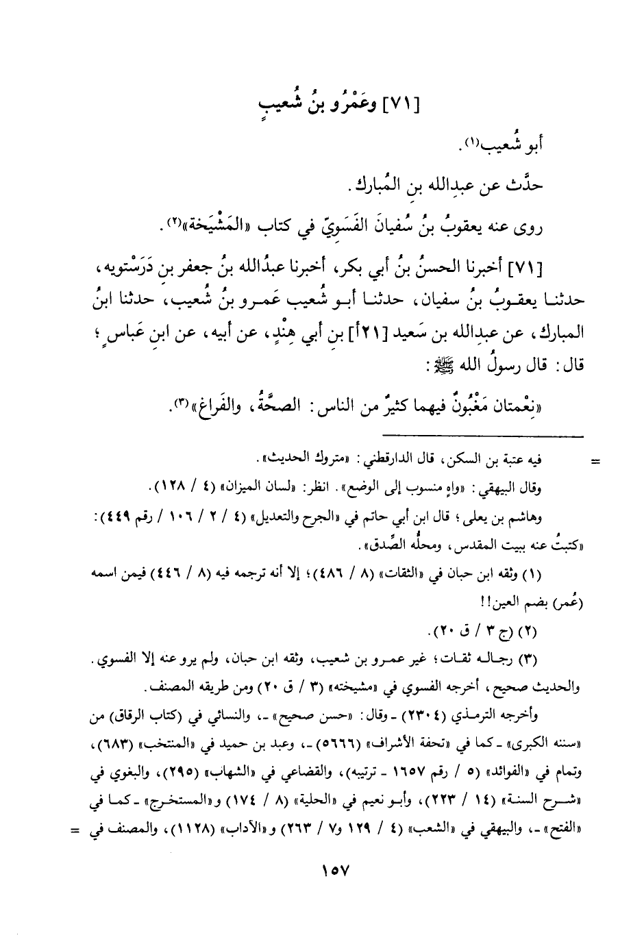 71 - أخبرنَا الْحسن بن أبي بكر أخبرنَا عبد الله بن جَعْفَر بن درسْتوَيْه حَدثنَا يَعْقُوب بن سُفْيَان حَدثنَا أَبُو شُعَيْب عَمْرو بن شُعَيْب حَدثنَا ابْن الْمُبَارك عَن عبد الله بن سعيد (21 أ) بن أبي هِنْد عَن أَبِيه عَن ابْن عَبَّاس قَالَ قَالَ رَسُول الله صلى الله عَلَيْهِ وَسلم نعمتان مغبون فيهمَا كثير من النَّاس الصِّحَّة والفراغ وَالثَّانِي