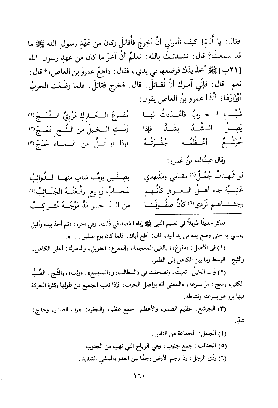 فَقَالَ يَا أَبَة كَيفَ تَأْمُرنِي أَن أخرج فأقاتل وَكَانَ من عهد رَسُول الله صلى الله عَلَيْهِ وَسلم مَا قد سَمِعت قَالَ نشدتك بِاللَّه تعلم أَن آخر مَا كَانَ من عهد رَسُول الله (21 ب) صلى الله عَلَيْهِ وَسلم أَخذ يدك فوضعها فِي يَدي فَقَالَ أطع عَمْرو بن الْعَاصِ قَالَ نعم قَالَ فَإِنِّي آمُرك أَن تقَاتل قَالَ فَخرج فقاتل فَلَمَّا وضعت الْحَرْب أَوزَارهَا أنشأ عَمْرو بن الْعَاصِ يَقُول