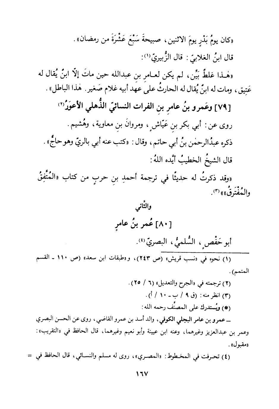 (79) وَعَمْرو بن عَامر بن الْفُرَات النَّسَائِيّ الذهلي الْأَعْوَر روى عَن أبي بكر بن عَيَّاش ومروان بن مُعَاوِيَة وهشيم ذكره عبد الرَّحْمَن بن أبي حَاتِم وَقَالَ كتب عَنهُ أبي بِالريِّ وَهُوَ حَاج قَالَ الشَّيْخ الْخَطِيب أيده الله وَقد ذكرت لَهُ حَدِيثا فِي تَرْجَمَة أَحْمد بن حَرْب من كتاب الْمُتَّفق والمفترق وَالثَّانِي