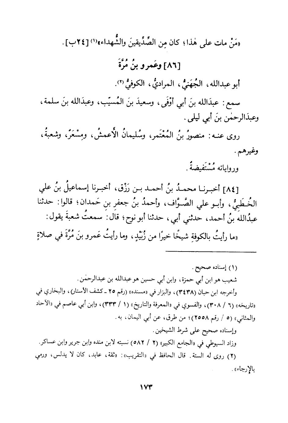 (86) وَعَمْرو بن مرّة أَبُو عبد الله الْجُهَنِيّ الْمرَادِي الْكُوفِي سمع عبد الله بن أبي أوفى وَسَعِيد بن الْمسيب