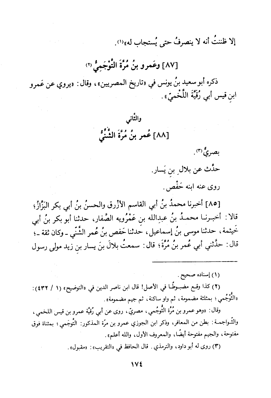 (87) وَعَمْرو بن مرّة التوجمي ذكره أَبُو سعيد بن يُونُس فِي تَارِيخ المصريين وَقَالَ يروي عَن عَمْرو ابْن قيس أبي رقية اللَّخْمِيّ وَالثَّانِي