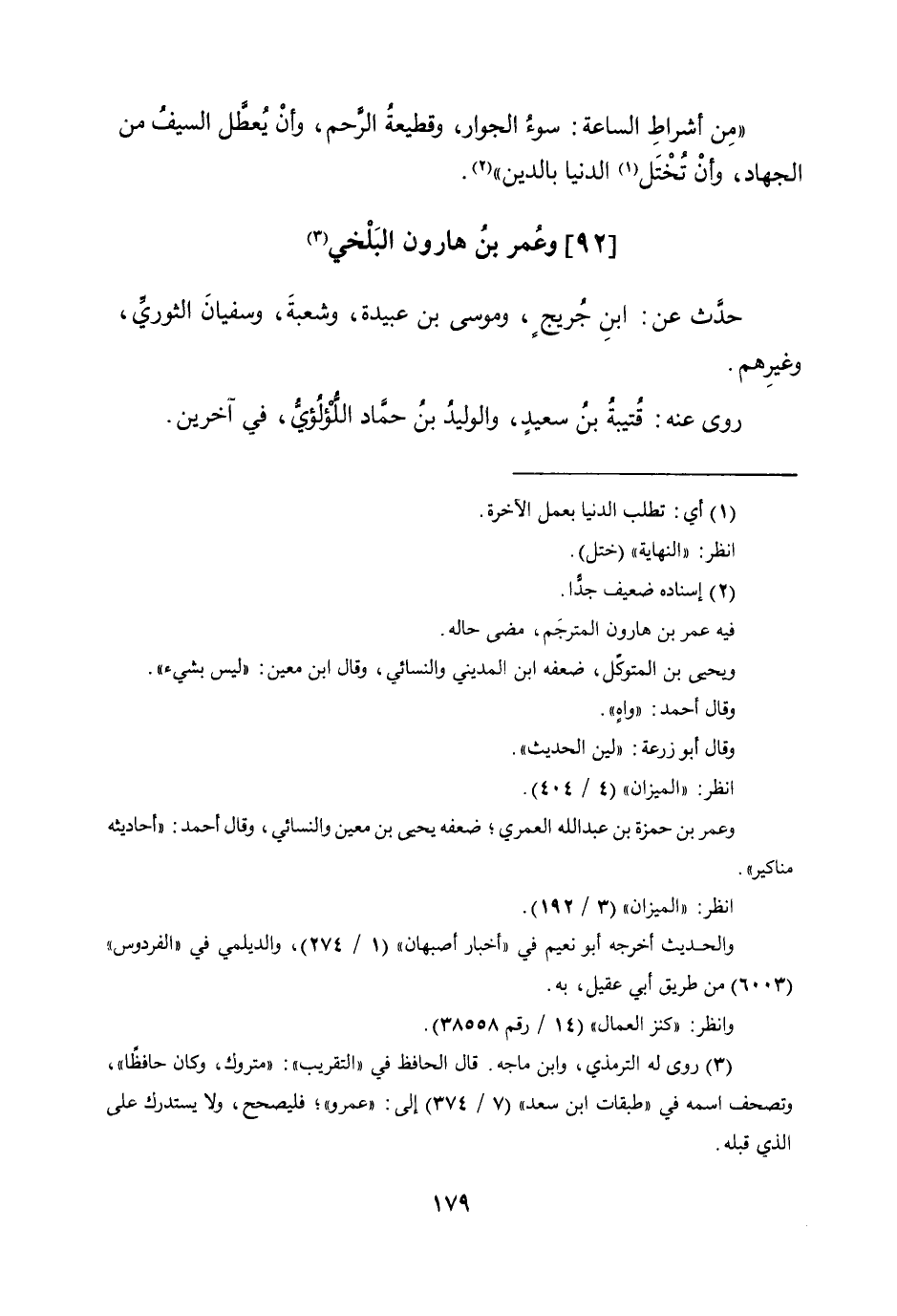 (92) وَعمر بن هَارُون الْبَلْخِي حدث عَن ابْن جريج ومُوسَى بن عُبَيْدَة وَشعْبَة وسُفْيَان الثَّوْريّ وَغَيرهم روى عَنهُ قُتَيْبَة