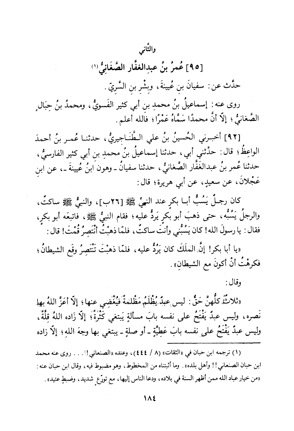 92 - أَخْبرنِي الْحُسَيْن بن عَليّ الطناجيري حَدثنَا عمر بن أَحْمد الْوَاعِظ قَالَ حَدثنِي أبي حَدثنَا إِسْمَاعِيل بن مُحَمَّد بن أبي كثير الْفَارِسِي حَدثنَا عمر بن عبد الْغفار الصغاني حَدثنَا سُفْيَان وهون ابْن عُيَيْنَة عَن ابْن عجلَان عَن سعيد عَن أبي هُرَيْرَة قَالَ كَانَ رجل يسب أَبَا بكر عِنْد النَّبِي صلى الله عَلَيْهِ وَسلم (26 ب) وَالنَّبِيّ صلى الله عَلَيْهِ وَسلم سَاكِت وَالرجل يسبه حَتَّى ذهب أَبُو بكر يرد عَلَيْهِ فَقَامَ النَّبِي صلى الله عَلَيْهِ وَسلم فَاتبعهُ أَبُو بكر فَقَالَ يَا رَسُول الله كَانَ يسبني وَأَنت سَاكِت فَلَمَّا ذهبت أنتصر قُمْت قَالَ يَا أَبَا بكر إِن الْملك كَانَ يرد عَلَيْهِ فَلَمَّا ذهبت تنتصر وَقع الشَّيْطَان فَكرِهت أَن أكون مَعَ الشَّيْطَان وَقَالَ ثَلَاث كُلهنَّ حق لَيْسَ عبد يظلم مظْلمَة فيغضي عَنْهَا إِلَّا أعز الله بهَا نَصره وَلَيْسَ عبد يفتح على نَفسه بَاب مَسْأَلَة يَبْتَغِي كَثْرَة إِلَّا زَاده الله قلَّة وَلَيْسَ عبد يفتح على نَفسه بَاب عَطِيَّة أَو صلَة يَبْتَغِي بهَا وَجه الله إِلَّا زَاده