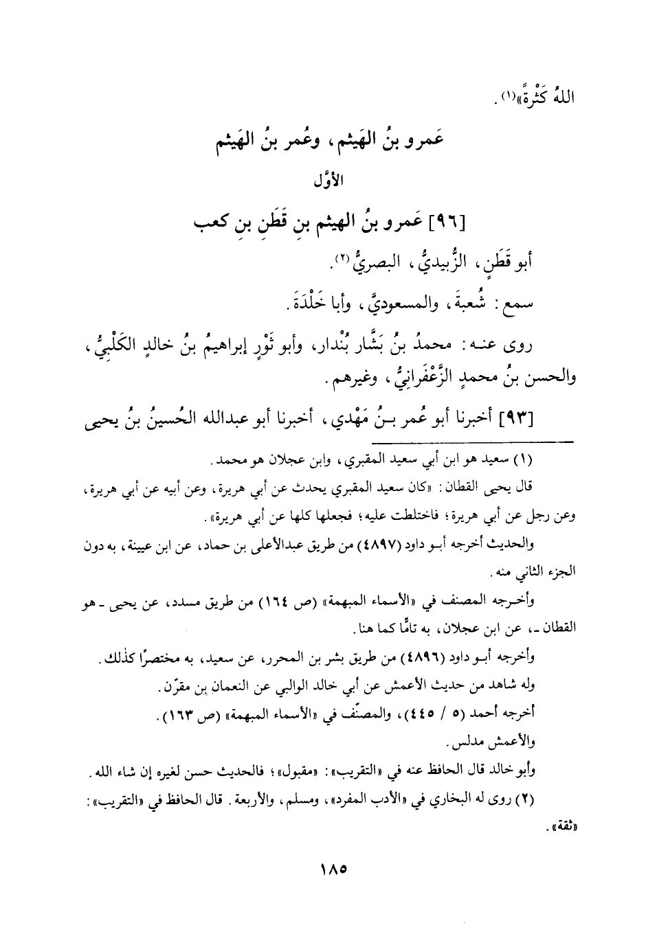 (96) عَمْرو بن الْهَيْثَم بن قطن بن كَعْب أَبُو قطن الزبيدِيّ الْبَصْرِيّ سمع شُعْبَة والمسعودي وَأَبا خلدَة روى عَنهُ مُحَمَّد بن بشار بنْدَار وَأَبُو ثَوْر إِبْرَاهِيم بن خَالِد الْكَلْبِيّ وَالْحسن بن مُحَمَّد الزَّعْفَرَانِي وَغَيرهم