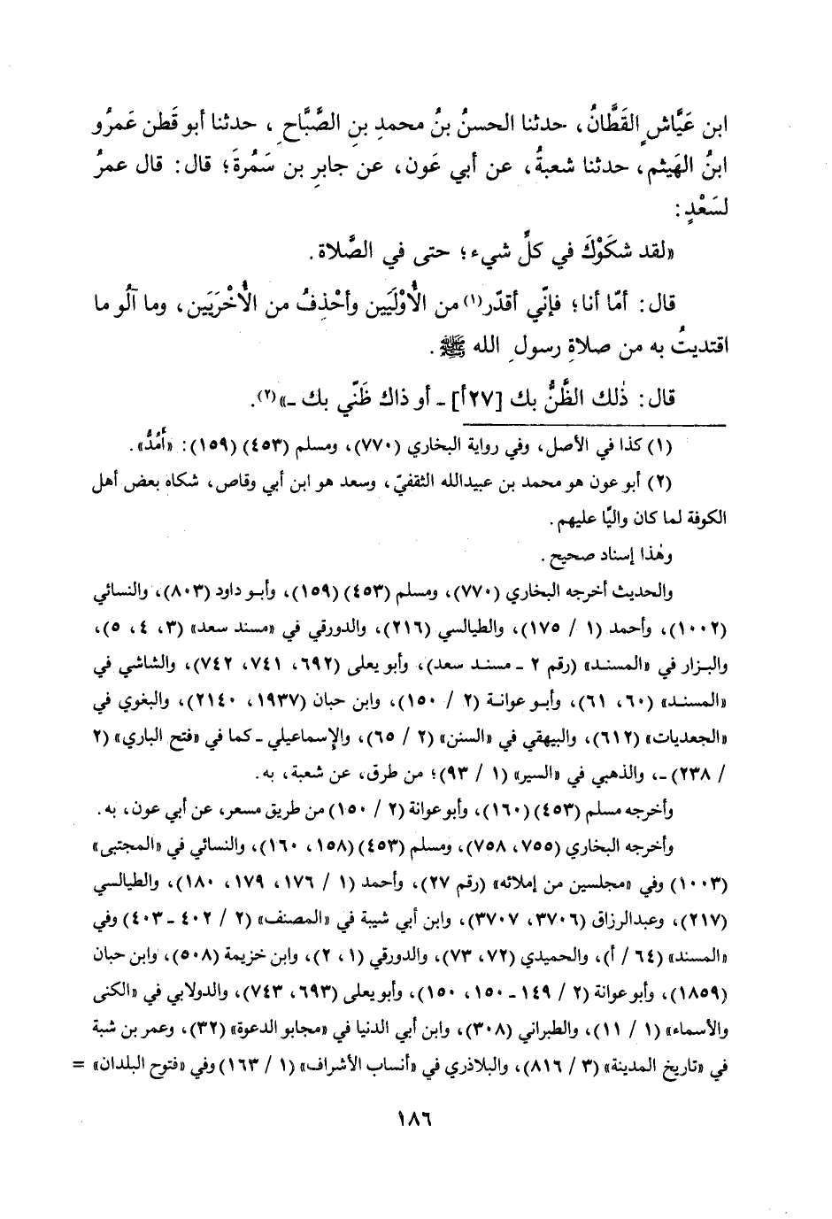 ابْن عَيَّاش الْقطَّان حَدثنَا الْحسن بن مُحَمَّد بن الصَّباح حَدثنَا أَبُو قطن عَمْرو ابْن الْهَيْثَم حَدثنَا شُعْبَة عَن أبي عون عَن جَابر بن سَمُرَة قَالَ قَالَ عمر لسعد لقد شكوك فِي كل شَيْء حَتَّى فِي الصَّلَاة قَالَ أما أَنا فَإِنِّي أقدر من الْأَوليين وأحذف من الْأُخْرَيَيْنِ وَمَا آلو مَا اقتديت بِهِ من صَلَاة رَسُول الله صلى الله عَلَيْهِ وَسلم قَالَ ذَلِك الظَّن بك (27 أ) أَو ذَاك ظَنِّي بك
