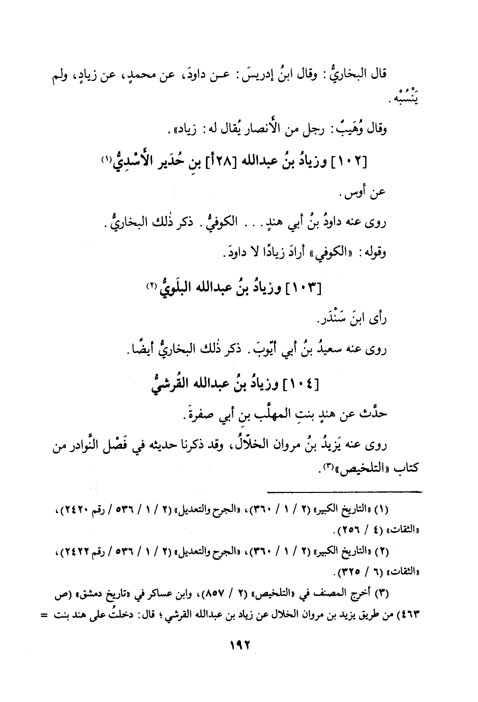 (102) وَزِيَاد بن عبد الله (28 أ) بن حدير الْأَسدي عَن أَوْس روى عَنهُ دَاوُد بن أبي هِنْد الْكُوفِي ذكر ذَلِك البُخَارِيّ وَقَوله الْكُوفِي أَرَادَ زيادا لَا دَاوُد
