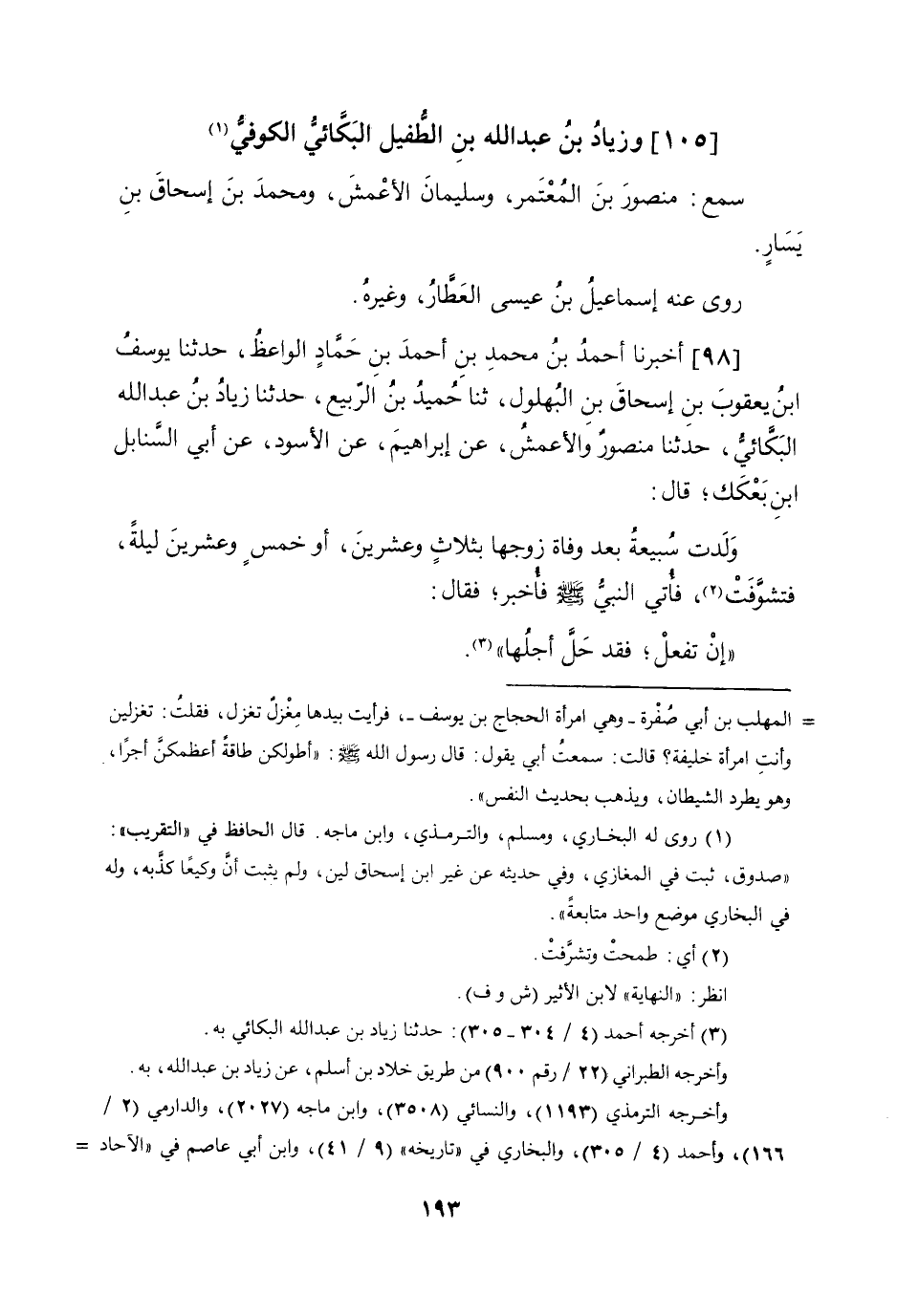 (105) وَزِيَاد بن عبد الله بن الطُّفَيْل البكائي الْكُوفِي سمع مَنْصُور بن الْمُعْتَمِر وَسليمَان الْأَعْمَش وَمُحَمّد بن إِسْحَاق بن يسَار روى عَنهُ إِسْمَاعِيل بن عِيسَى الْعَطَّار وَغَيره