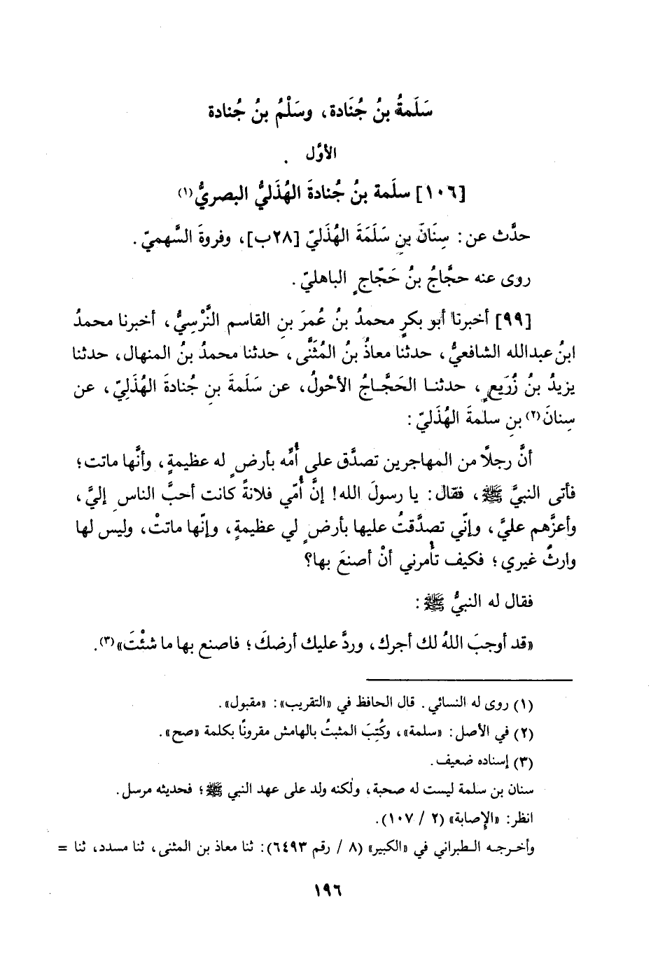 99 - أخبرنَا أَبُو بكر مُحَمَّد بن عمر بن الْقَاسِم النَّرْسِي أخبرنَا مُحَمَّد ابْن عبد الله الشَّافِعِي حَدثنَا معَاذ بن الْمثنى حَدثنَا مُحَمَّد بن الْمنْهَال حَدثنَا يزِيد بن زُرَيْع حَدثنَا الْحجَّاج الْأَحول عَن سَلمَة بن جُنَادَة الْهُذلِيّ عَن سِنَان بن سَلمَة الْهُذلِيّ أَن رجلا من الْمُهَاجِرين تصدق على أمه بِأَرْض لَهُ عَظِيمَة وَأَنَّهَا مَاتَت فَأتى النَّبِي صلى الله عَلَيْهِ وَسلم فَقَالَ يَا رَسُول الله إِن أُمِّي فُلَانَة كَانَت أحب النَّاس إِلَيّ وأعزهم عَليّ وَإِنِّي تَصَدَّقت عَلَيْهَا بِأَرْض لي عَظِيمَة وَإِنَّهَا مَاتَت وَلَيْسَ لَهَا وَارِث غَيْرِي فَكيف تَأْمُرنِي أَن أصنع بهَا فَقَالَ لَهُ النَّبِي صلى الله عَلَيْهِ وَسلم قد أوجب الله لَك أجرك ورد عَلَيْك أَرْضك فَاصْنَعْ بهَا مَا شِئْت