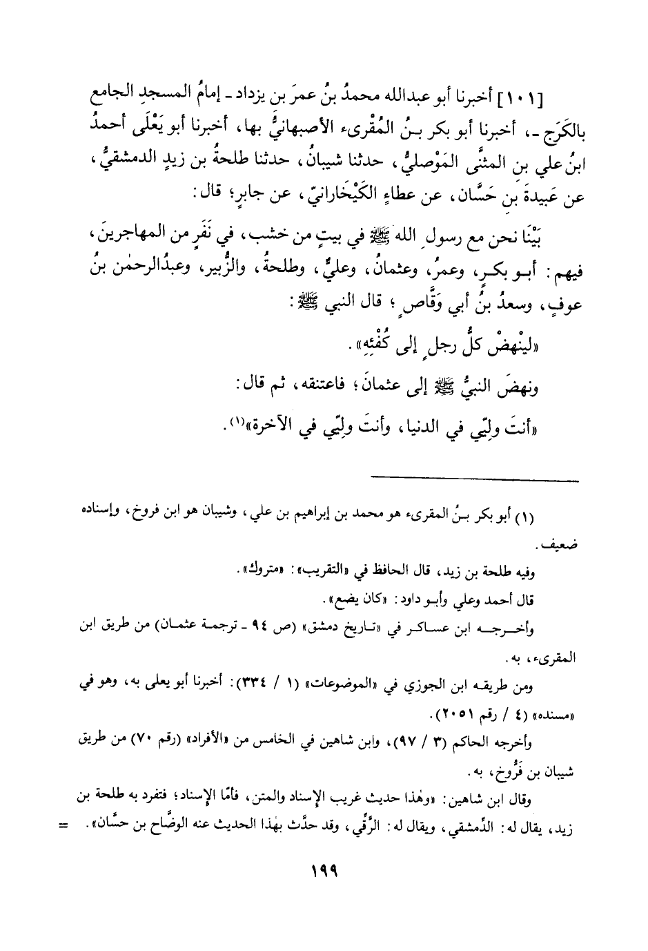 101 - أخبرنَا أَبُو عبد الله مُحَمَّد بن عمر بن يزْدَاد إِمَام الْمَسْجِد الْجَامِع بالكرج أخبرنَا أَبُو بكر بن الْمُقْرِئ الْأَصْبَهَانِيّ بهَا أخبرنَا أَبُو يعلى أَحْمد ابْن عَليّ بن الْمثنى الْموصِلِي حَدثنَا شَيبَان حَدثنَا طَلْحَة بن زيد الدِّمَشْقِي عَن عُبَيْدَة بن حسان عَن عَطاء الكيخاراني عَن جَابر قَالَ بَينا نَحن مَعَ رَسُول الله صلى الله عَلَيْهِ وَسلم فِي بَيت من خشب فِي نفر من الْمُهَاجِرين فيهم أَبُو بكر وَعمر وَعُثْمَان وَعلي وَطَلْحَة وَالزُّبَيْر وَعبد الرَّحْمَن بن عَوْف وَسعد بن أبي وَقاص قَالَ النَّبِي صلى الله عَلَيْهِ وَسلم لينهض كل رجل إِلَى كفئه ونهض النَّبِي صلى الله عَلَيْهِ وَسلم إِلَى عُثْمَان فاعتنقه ثمَّ قَالَ أَنْت وليي فِي الدُّنْيَا وَأَنت وليي فِي الْآخِرَه