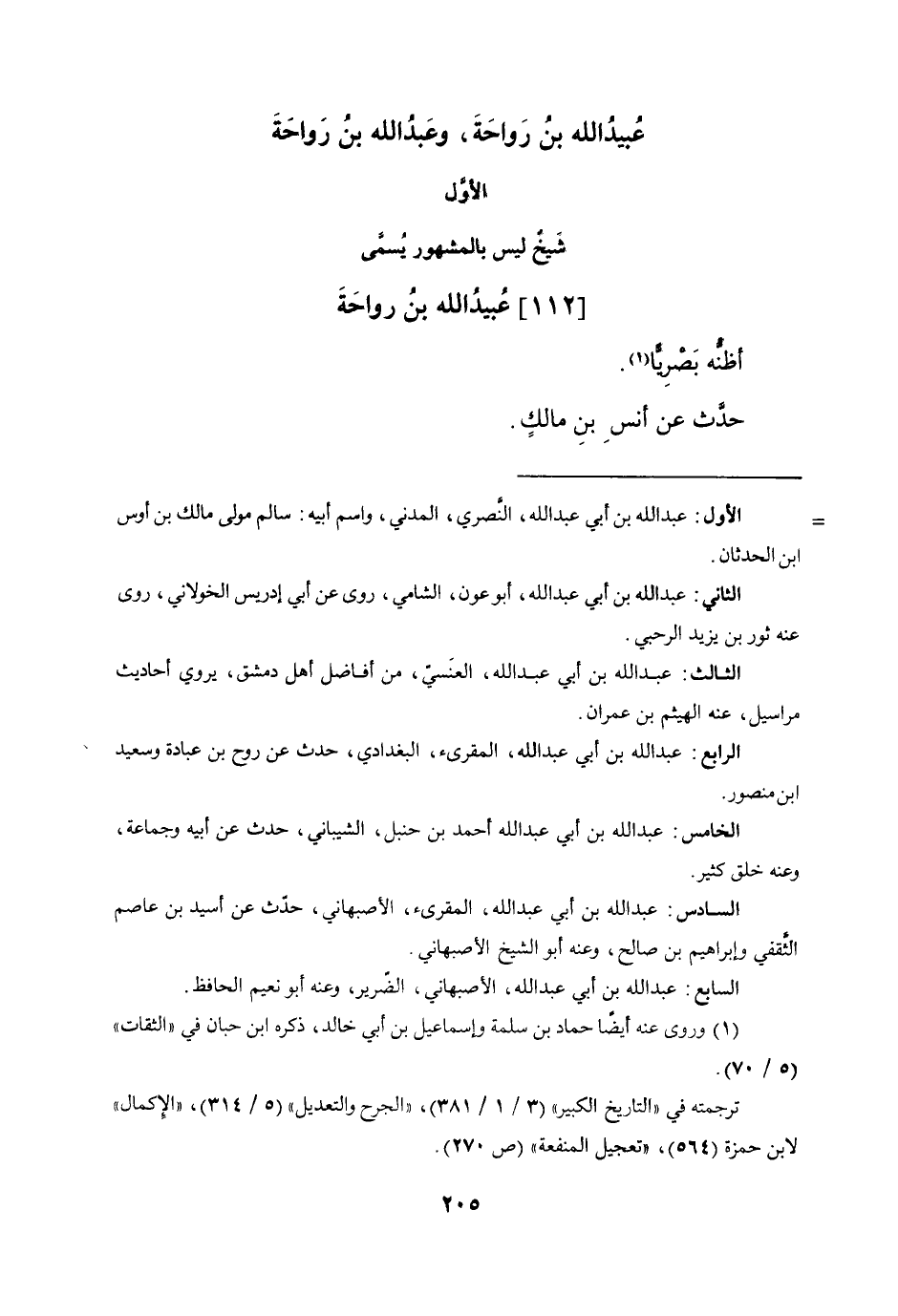 عبيد الله بن رَوَاحَة وَعبد الله بن رَوَاحَة الأول شيخ لَيْسَ بالمشهور يُسمى (112) عبيد الله بن رَوَاحَة أَظُنهُ بصريا حدث عَن أنس بن مَالك
