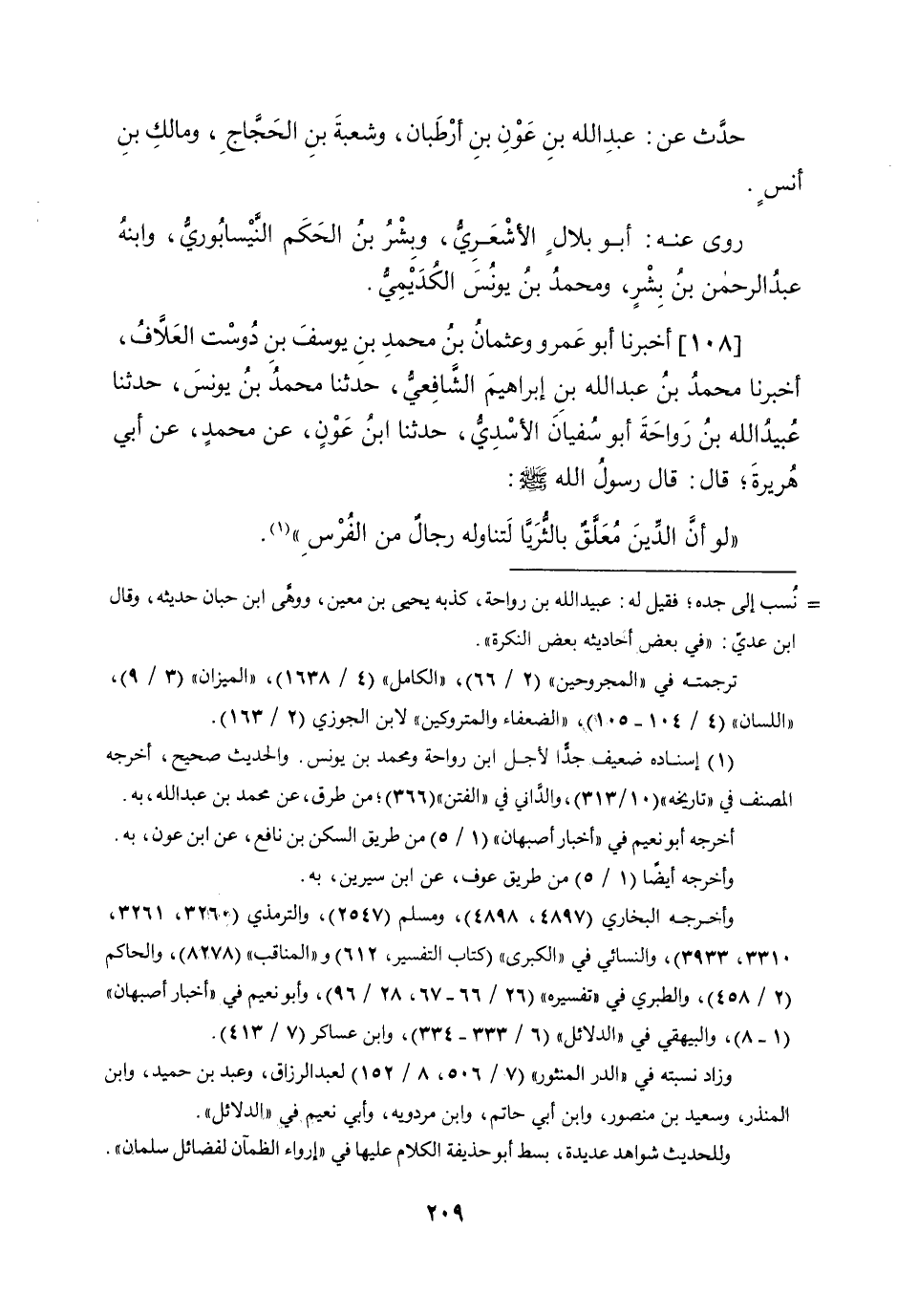 108 - أخبرنَا أَبُو عَمْرو وَعُثْمَان بن مُحَمَّد بن يُوسُف بن دوست العلاف أخبرنَا مُحَمَّد بن عبد الله بن إِبْرَاهِيم الشَّافِعِي حَدثنَا مُحَمَّد بن يُونُس حَدثنَا عبيد الله بن رَوَاحَة أَبُو سُفْيَان الْأَسدي حَدثنَا ابْن عون عَن مُحَمَّد عَن أبي هُرَيْرَة قَالَ قَالَ رَسُول الله صلى الله عَلَيْهِ وَسلم لَو أَن الدّين مُعَلّق بِالثُّرَيَّا لتنَاوله رجال من الْفرس وَالثَّانِي