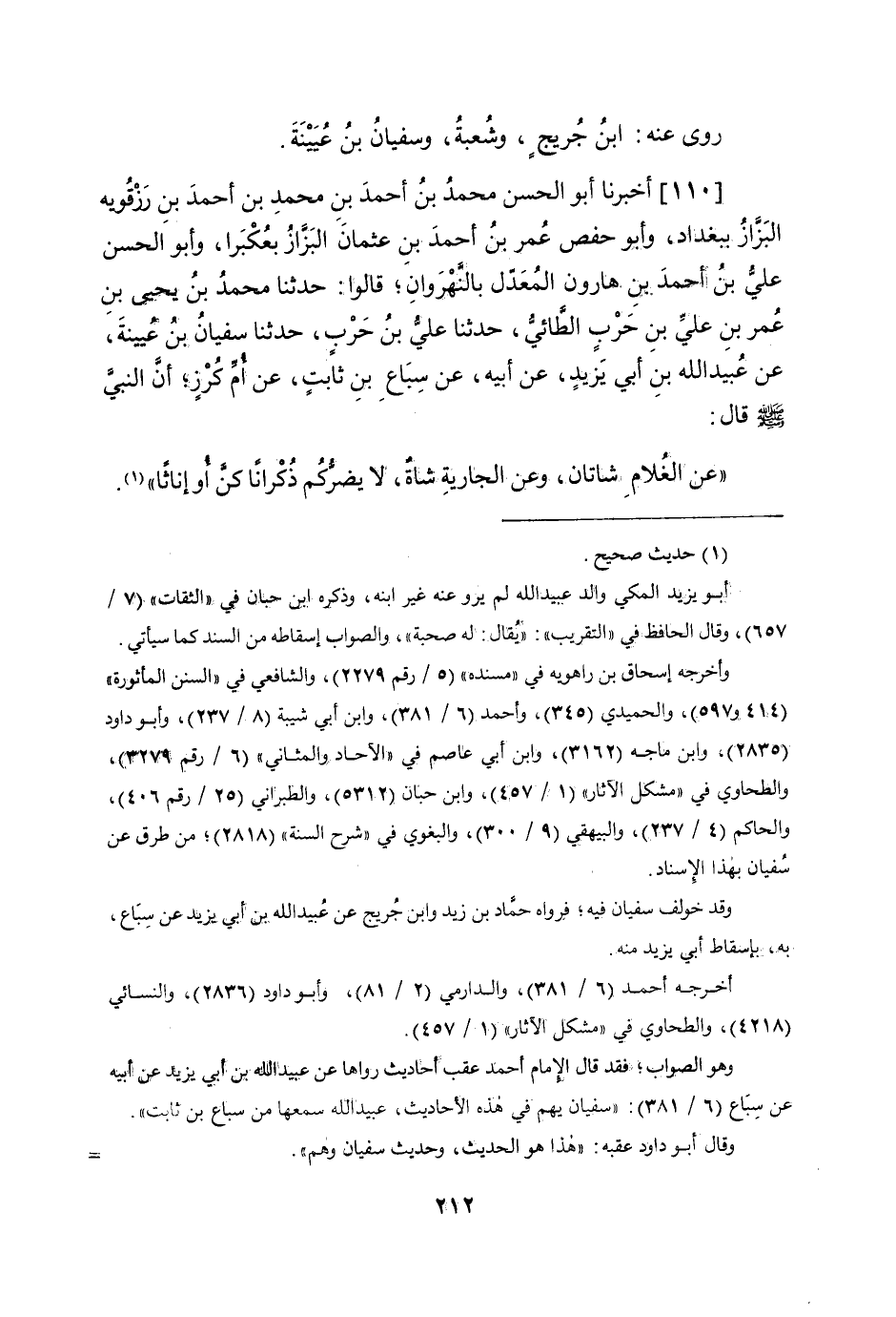 110 - أخبرنَا أَبُو الْحسن مُحَمَّد بن أَحْمد بن مُحَمَّد بن أَحْمد بن رزقويه الْبَزَّاز بِبَغْدَاد وَأَبُو حَفْص عمر بن أَحْمد بن عُثْمَان الْبَزَّاز بعكبرا وَأَبُو الْحسن عَليّ بن أَحْمد بن هَارُون الْمعدل بالنهروان قَالُوا حَدثنَا مُحَمَّد بن يحيى بن عمر بن عَليّ بن حَرْب الطَّائِي حَدثنَا عَليّ بن حَرْب حَدثنَا سُفْيَان بن عُيَيْنَة عَن عبيد الله بن أبي يزِيد عَن أَبِيه عَن سِبَاع بن ثَابت عَن أم كرز أَن النَّبِي صلى الله عَلَيْهِ وَسلم قَالَ عَن الْغُلَام شَاتَان وَعَن الْجَارِيَة شَاة لَا يضركم ذكرانا كن أَو إِنَاثًا وَالثَّانِي