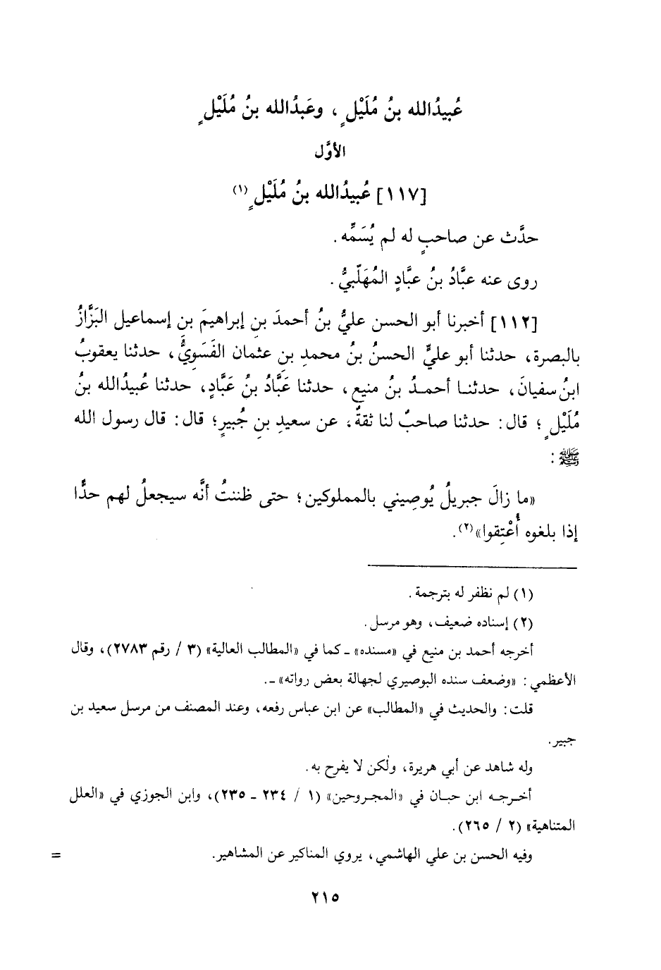 112 - أخبرنَا أَبُو الْحسن عَليّ بن أَحْمد بن إِبْرَاهِيم بن إِسْمَاعِيل الْبَزَّاز بِالْبَصْرَةِ حَدثنَا أَبُو عَليّ الْحسن بن مُحَمَّد بن عُثْمَان الْفَسَوِي حَدثنَا يَعْقُوب ابْن سُفْيَان حَدثنَا أَحْمد بن منيع حَدثنَا عباد بن عباد حَدثنَا عبيد الله بن مليل قَالَ حَدثنَا صَاحب لنا ثِقَة عَن سعيد بن جُبَير قَالَ قَالَ رَسُول الله صلى الله عَلَيْهِ وَسلم مَا زَالَ جِبْرِيل يوصيني بالمملوكين حَتَّى ظَنَنْت أَنه سَيجْعَلُ لَهُم حدا إِذا بلغوه أعتقوا وَالثَّانِي