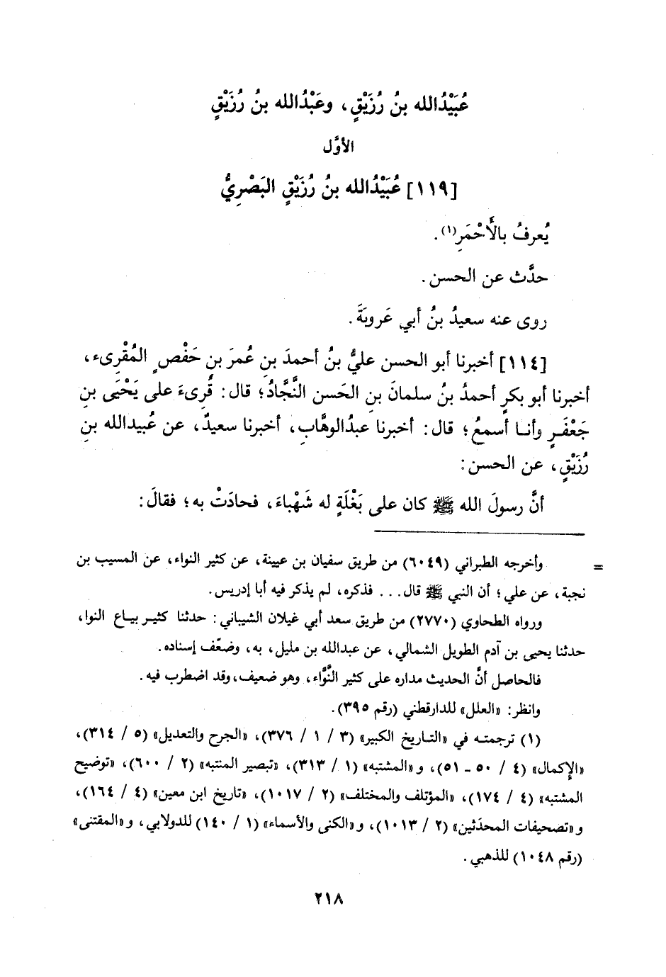 (119) عبيد الله بن رُزَيْق الْبَصْرِيّ يعرف بالأحمر حدث عَن الْحسن روى عَنهُ سعيد بن أبي عرُوبَة