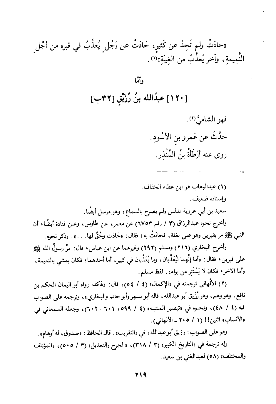 120 - عبد الله بن رُزَيْق (32 ب) فَهُوَ الشَّامي حدث عَن عَمْرو بن الْأسود روى عَنهُ أَرْطَأَة بن الْمُنْذر وَقد ذَكرْنَاهُ وسقنا حَدِيثه فِي كتاب التَّلْخِيص مَعَ نَظِيره عبد الله بن زُرَيْق بِتَقْدِيم الزَّاي