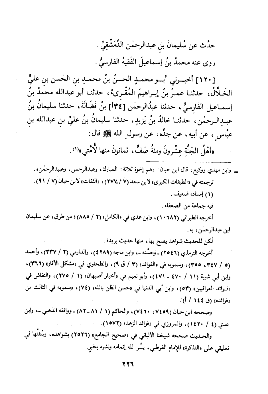 120 - أَخْبرنِي أَبُو مُحَمَّد الْحسن بن مُحَمَّد بن الْحسن بن عَليّ الْخلال حَدثنَا عمر بن إِبْرَاهِيم الْمُقْرِئ حَدثنَا أَبُو عبد الله مُحَمَّد بن إِسْمَاعِيل الْفَارِسِي حَدثنَا عبد الرَّحْمَن (34 أ) بن فضَالة حَدثنَا سُلَيْمَان بن عبد الرَّحْمَن حَدثنَا خَالِد بن يزِيد حَدثنَا سُلَيْمَان بن عَليّ بن عبد الله بن عَبَّاس عَن أَبِيه عَن جده عَن رَسُول الله صلى الله عَلَيْهِ وَسلم قَالَ أهل الْجنَّة عشرُون ومئة صف ثَمَانُون مِنْهَا لأمتي