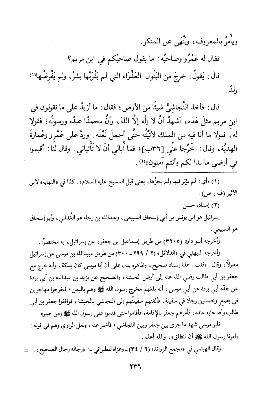 وَيَأْمُر بِالْمَعْرُوفِ وَينْهى عَن الْمُنكر فَقَالَ لَهُ عَمْرو وَصَاحبه مَا يَقُول صَاحبكُم فِي ابْن مَرْيَم قَالَ يَقُول خرج من البتول الْعَذْرَاء الَّتِي لم يقربهَا بشر وَلم يفرضها ولد قَالَ فَأخذ النَّجَاشِيّ شَيْئا من الأَرْض فَقَالَ مَا أَزِيد على مَا تَقولُونَ فِي ابْن مَرْيَم مثل هَذِه أشهد أَن لَا إِلَه إِلَّا الله وَأَن مُحَمَّدًا عَبده وَرَسُوله فقولا لَهُ فلولا مَا أَنا فِيهِ من الْملك لأتيته حَتَّى أحمل نَعله ورد على عَمْرو وَعمارَة الْهَدِيَّة وَقَالَ اخرجا عني (36 ب) فَمَا أُبَالِي أَن لَا تأتياني وَقَالَ لنا أقِيمُوا فِي أرضي مَا بدا لكم وَأَنْتُم آمنون